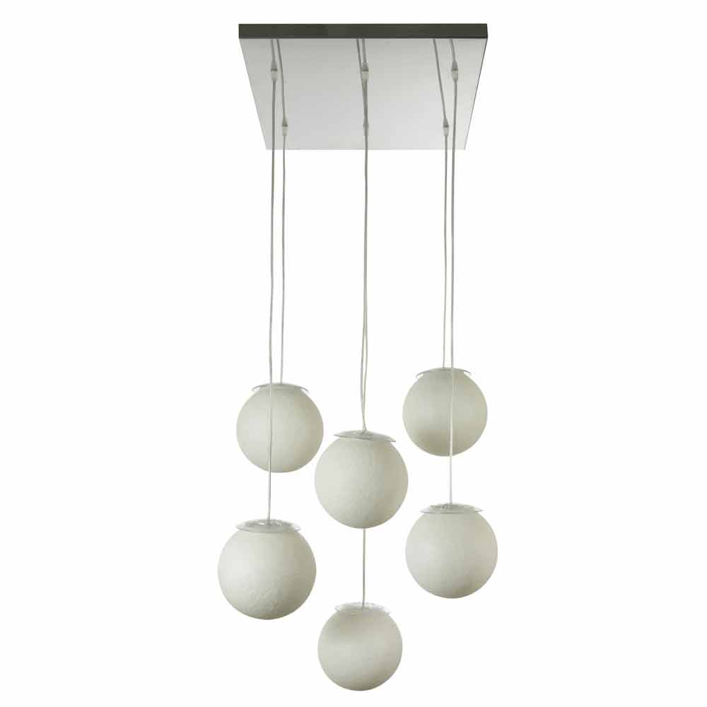 Ka një strukturë çeliku dhe gjashtë sfera në Nebulite®, një material i përbërë nga rrëshirë dhe fibra, venat e të cilit i japin llambës një efekt të veçantë hënor. Falë dizajnit të tij simpatik dhe elegant, është i përshtatshëm për të dekoruar zonën tuaj të banimit ose të kontratës.