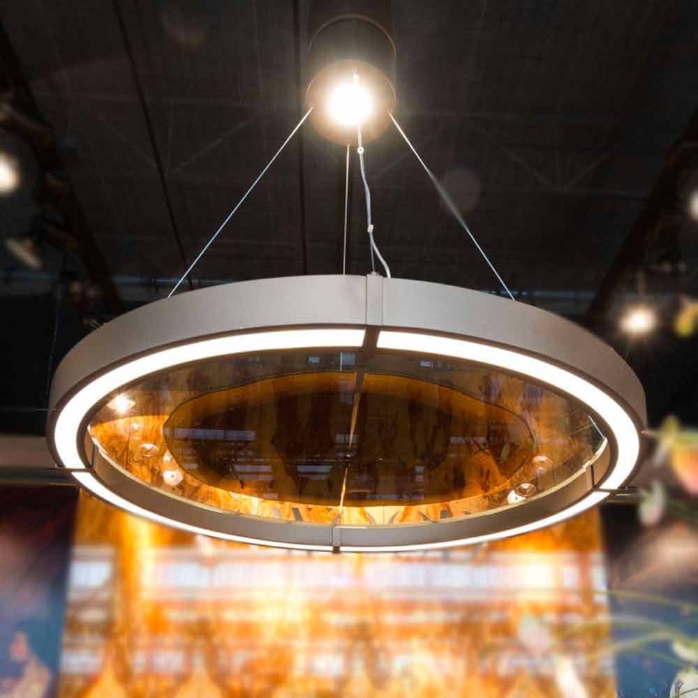 Llambadar modernme strukturë çeliku të përfunduar prej bronzi me një formë rrethore brenda së cilës gjejmë një pllakë xhami të bashkuar të përfunduar me një insert në dru arre kanaleti . Prodhuar në Itali përmes përdorimit të lëndëve të para cilësore , ky plotësues ofron një ide origjinale dhe joshëse të ndriçimit që mishëron elegancën dhe bashkëkohësinë. Veçantia e saj përfaqësohet nga kombinimi i mrekullueshëm i ngjyrave dhe përfundimeve të zgjedhura që sjellin në jetë një vepër të vërtetë arti të aftë të revolucionarizojë çdo zonë të shtëpisë falë takimit midis modernitetit të metalit, elegancës së përjetshme të xhamit dhe ngjyrave të mrekullueshme të druri dhe drithi i saj. Forma dhe dimensionet që nënvizojnë estetikën e saj e bëjnë atë një zgjidhje perfekte për të ndriçuar hapësira të mëdha si dhomat e ngrënies ose dhomat e ndenjes ku plotëson mobiljet me një prekje të rafinuar dhe inovative, duke krijuar një atmosferë të shkëlqyer të ngrohtë dhe mikpritëse .
