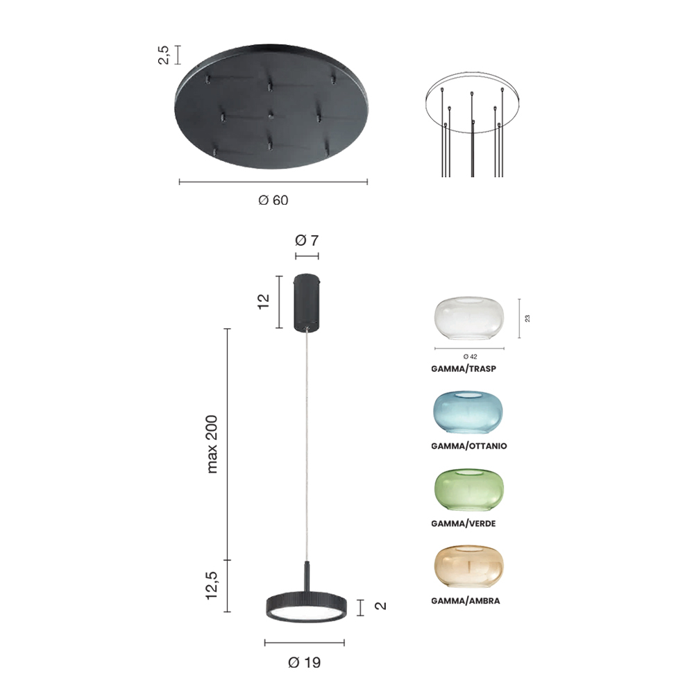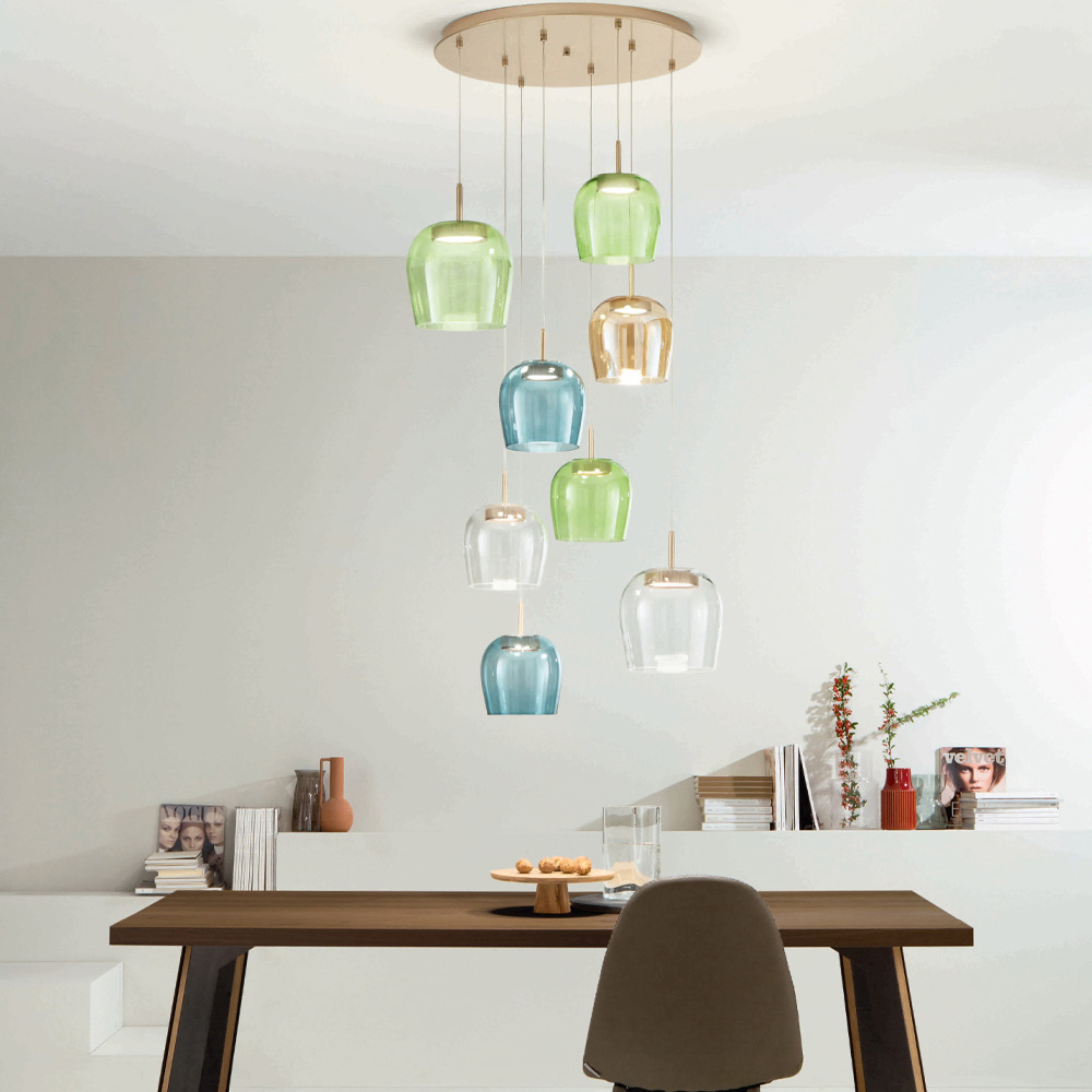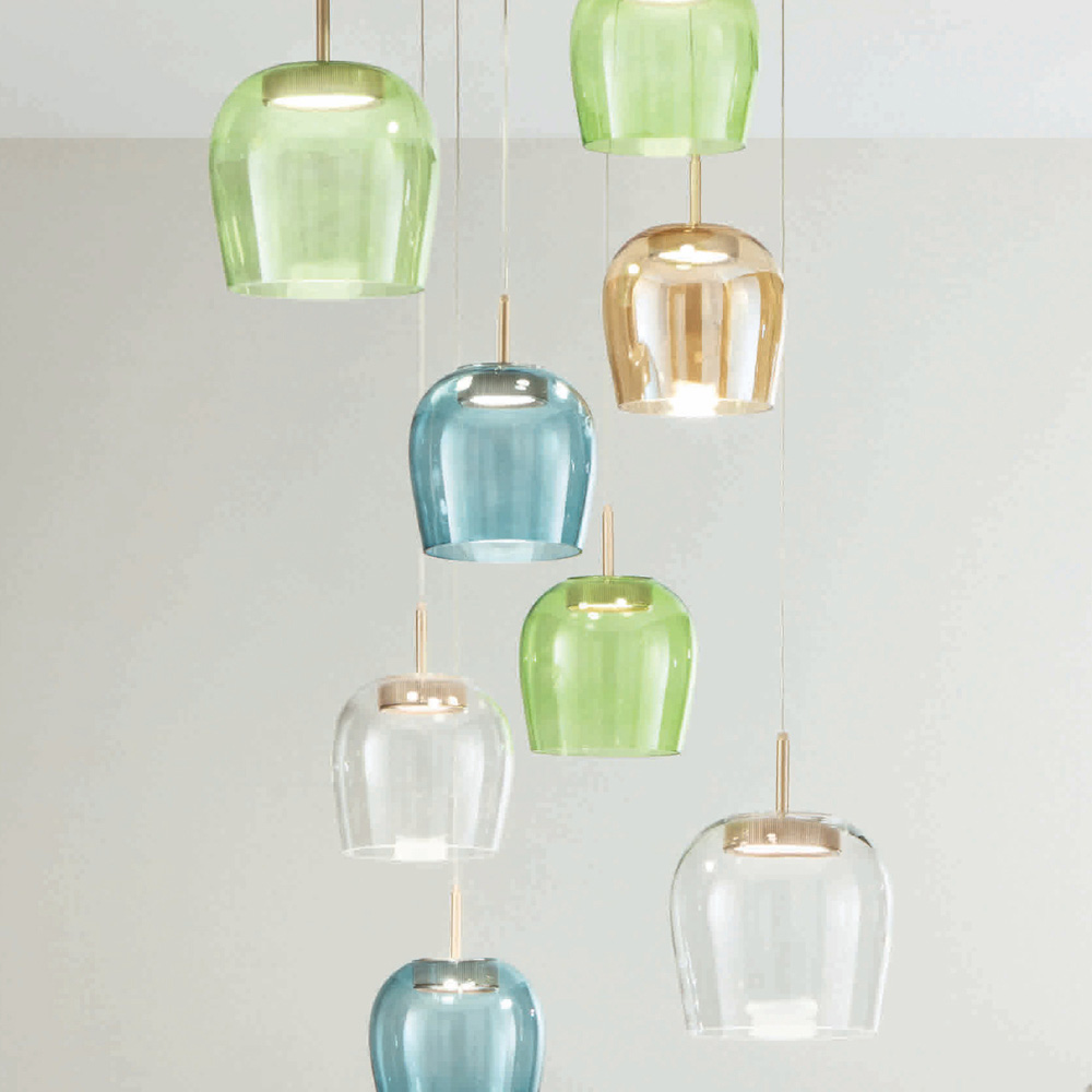 Llambadar tërësisht i prodhuar në Itali prej metali të lyer ari me kabllo të rregullueshme në gjatësi dhe drita LED me abazhur xhamime ngjyrë të lëvizshëm . Ky produkt synon të përmirësojë traditën përmes një qasjeje bashkëkohore ku stili, klasi dhe inovacioni bashkohen për të krijuar formula të reja dizajni për të mobiluar dhe ndriçuar çdo ambient me shije dhe karakter. Pikat e forta janë veçantia e formave , cilësia e materialeve dhe veçantia e burimit të dritës .