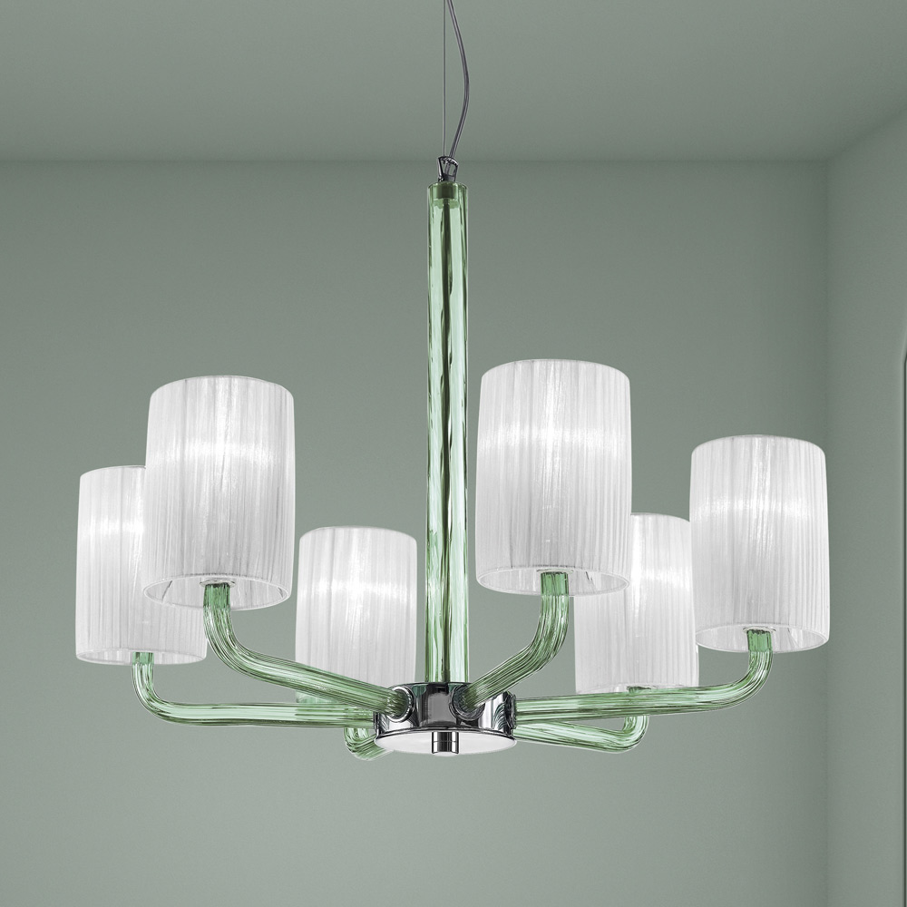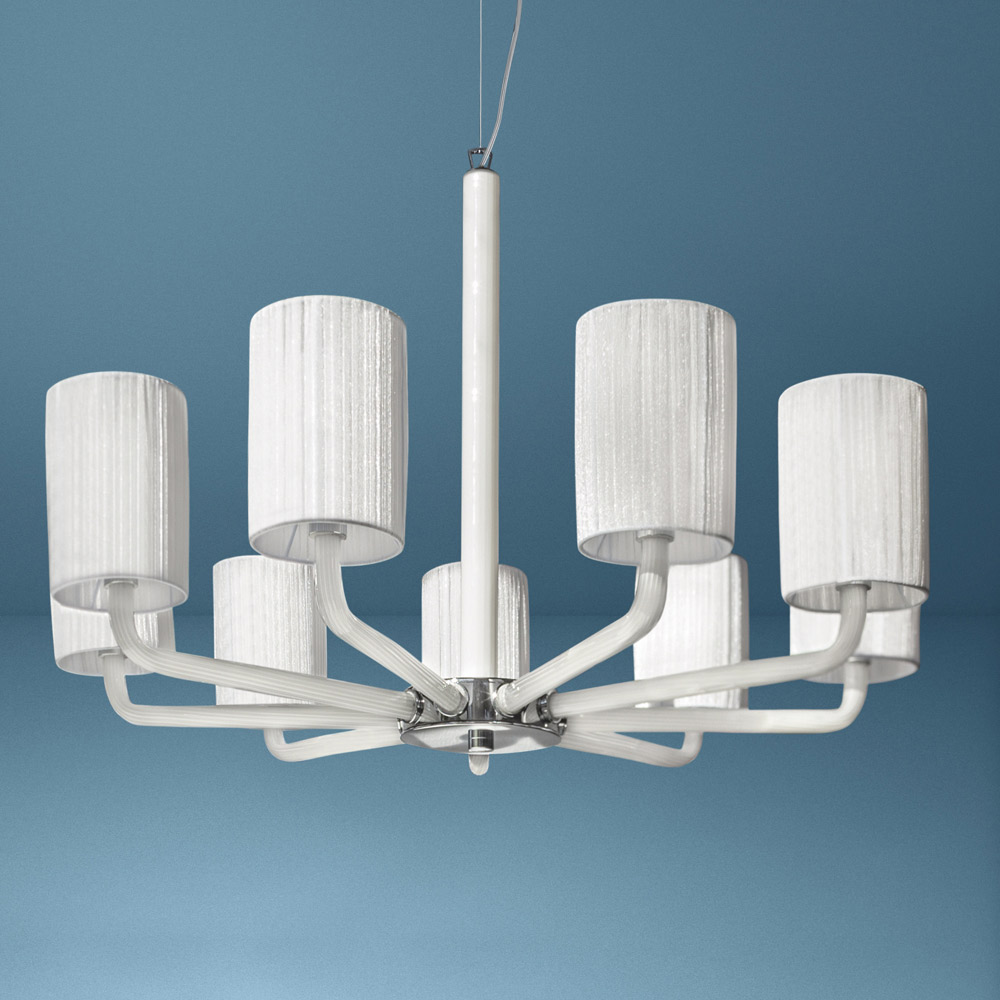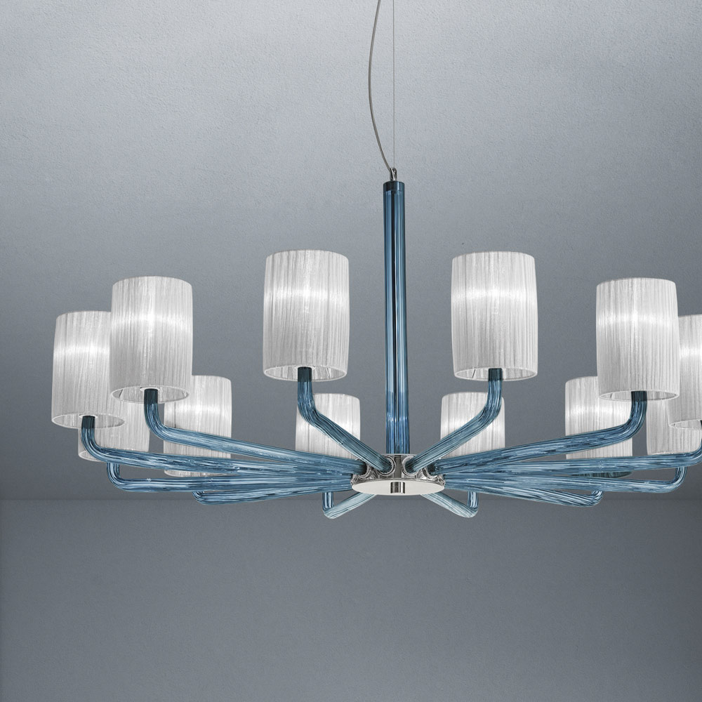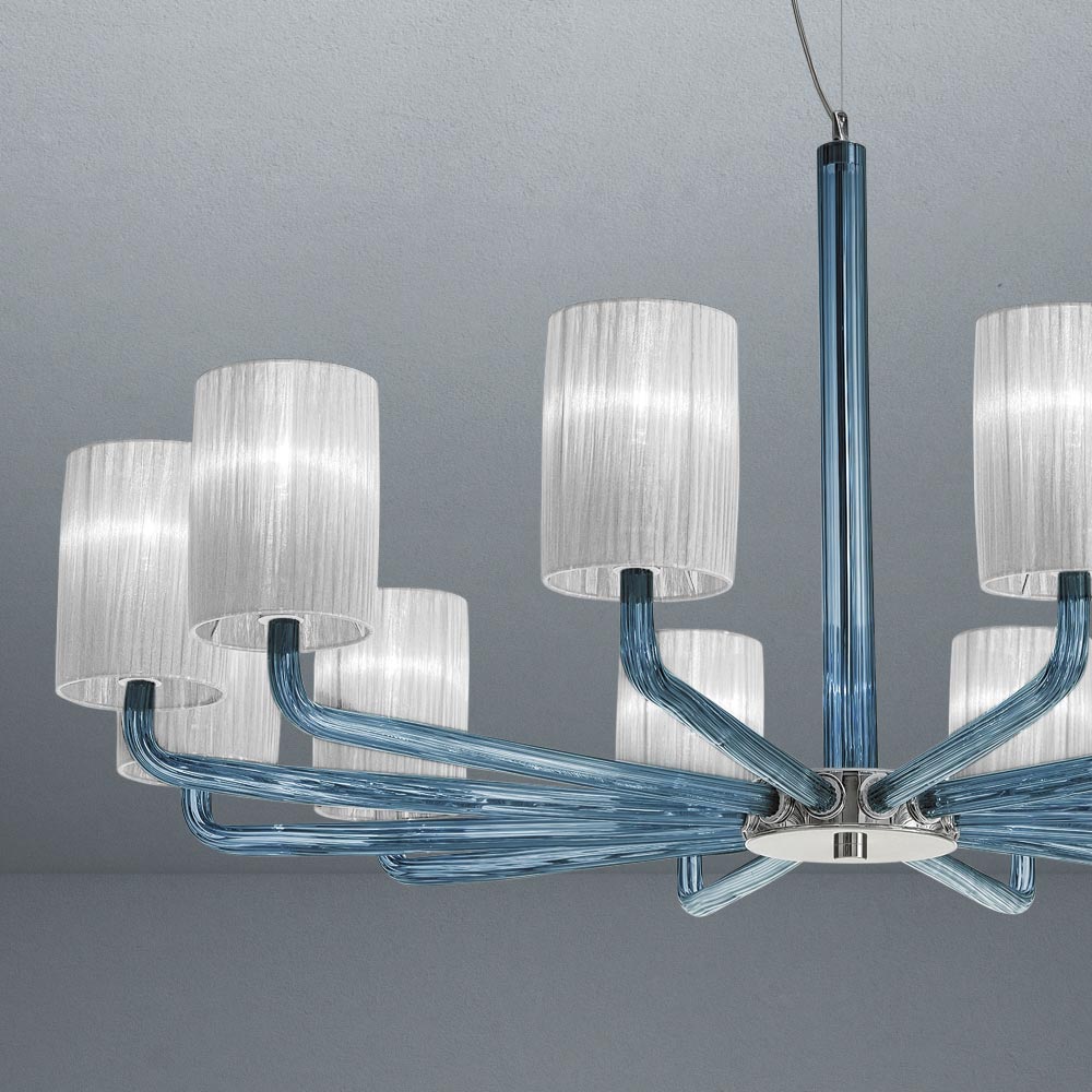 pranisë së tij të fortë skenike tipike për llambadarët klasikë të së shkuarës. Krahët e qelqit me tuba mbështesin në një mënyrë delikate dhe me klas abazhurët e mrekullueshëm prej pëlhure që ndihmojnë për të bartur dritën në çdo drejtim për një ndriçim të