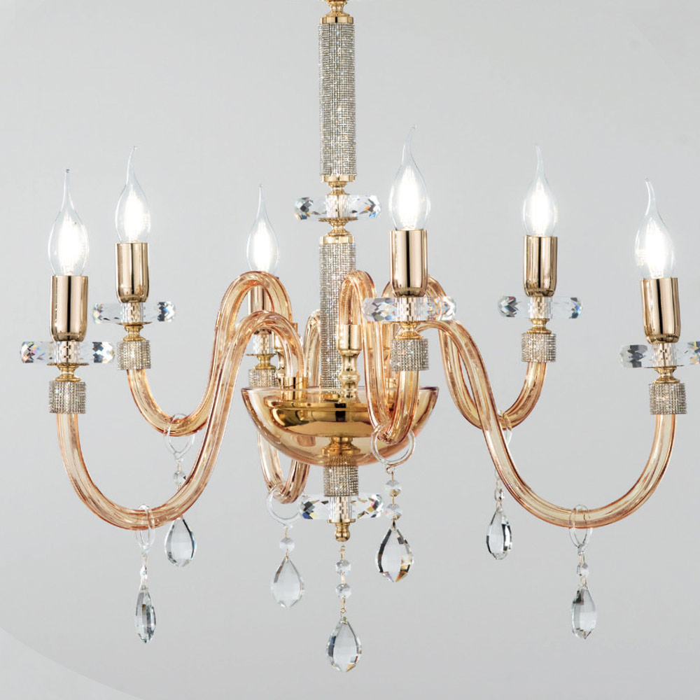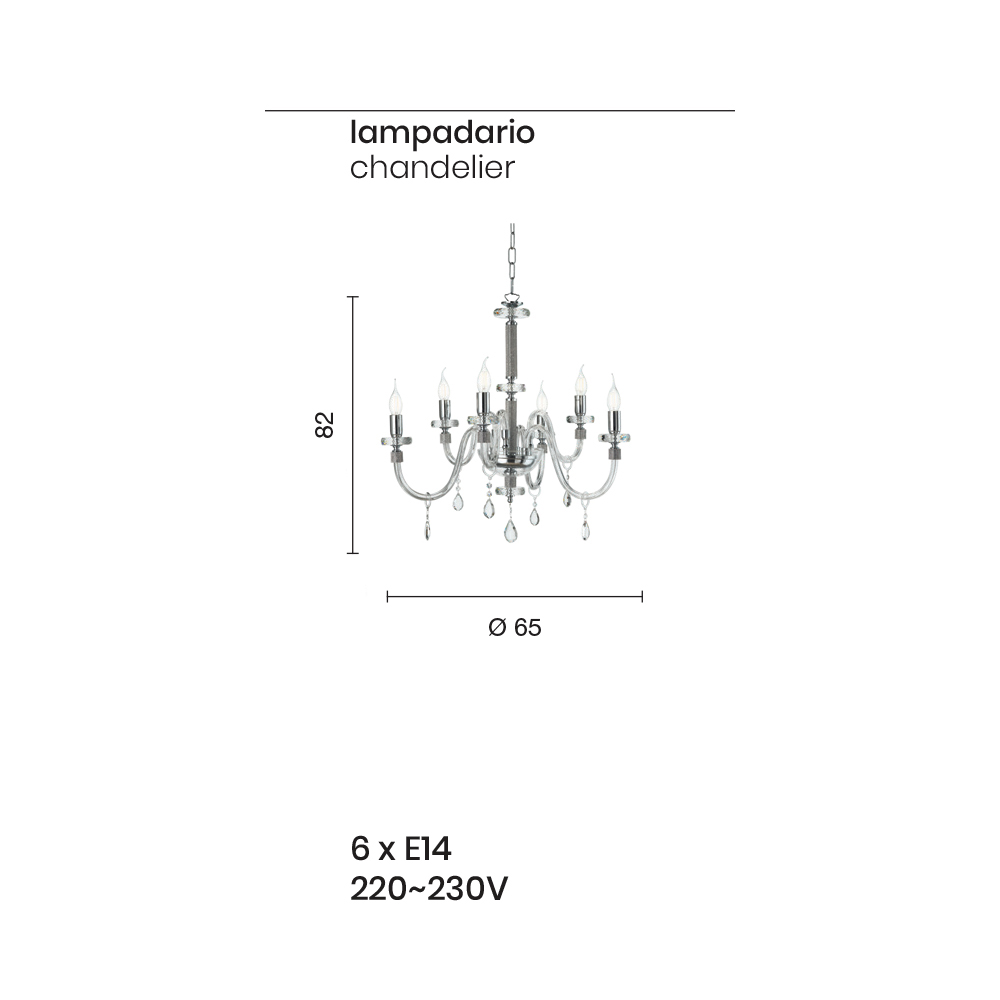 Ky llambadar varëse i stilit klasik përbëhet nga 6 krahë të harkuar prej xhami të punuar me dorë në Itali, efekti "rigaton" qelibar, fundi i të cilit është i rrethuar me shkëlqim të vendosur në metal, si dhe pjesa qendrore e komplementit. ku dy tuba disqe rrethore mbështesin strukturën e ndërthurur me dy disqe rrethore të madhësive të ndryshme të bëra prej kristali të prerë.