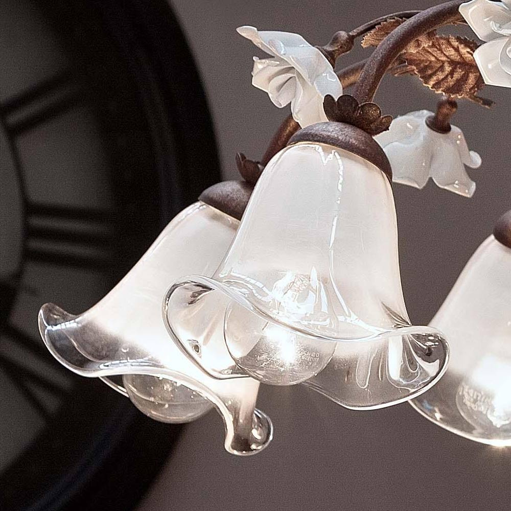 Llambadar me 8 llamba me dekorim prej hekuri, qelqi dhe trëndafili qeramike i prodhuar në Itali nga Ferroluce.