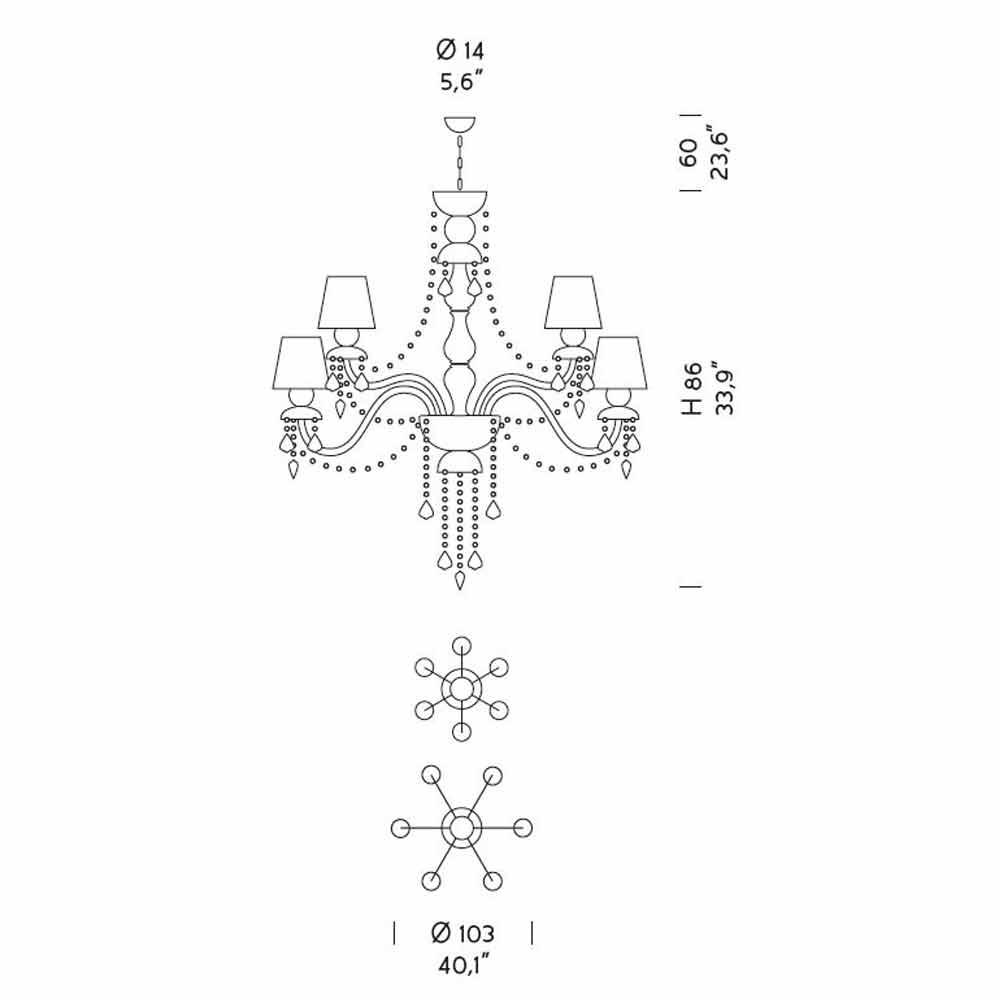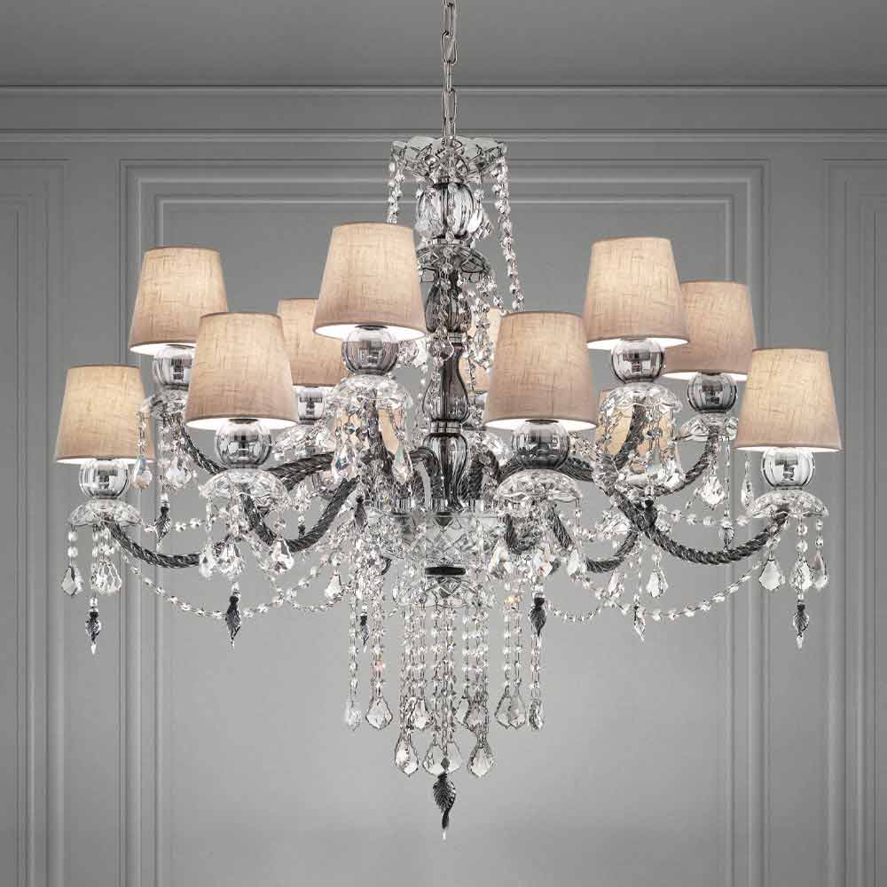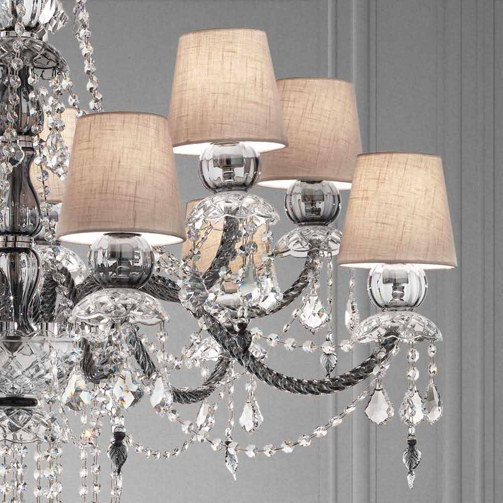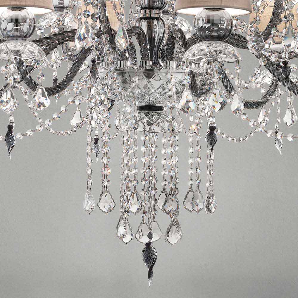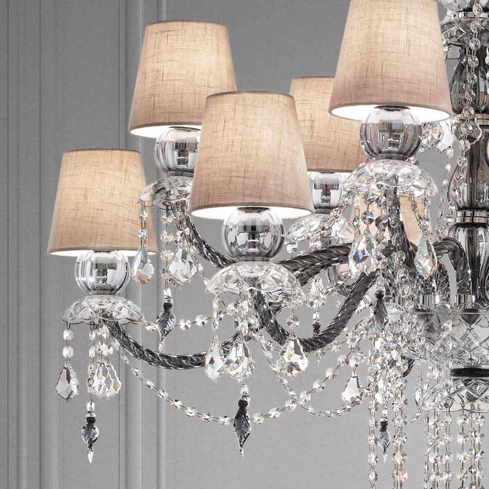 Llambadar elegant dhe imponues me 12 abazhurë prej liri , strukturë në fund gri venecian prej xhami të pasuruar me varëse në fund kristali dhe detaje nga metali i kromuar i lëmuar , i punuar me dorë në Itali . Karakterizuar nga një karakter romantik në gjendje të mbushë dhoma të mëdha në një mënyrë ekskluzive, ky llambadar bie në sy falë varëseve me shkëlqim dhe abazhurëve të rafinuar që i japin jetë një zgjidhje dinamike mobilimime një ndikim të fortë skenografik . Për të rritur vlerën e saj dhe për të nënvizuar anën e saj estetike është prania e sequins të cilat, përmes thyerjes së dritës, u japin jetë lojërave të mrekullueshme të dritës dhe hijes në sajë të ndezjeve me ngjyra të papara .
