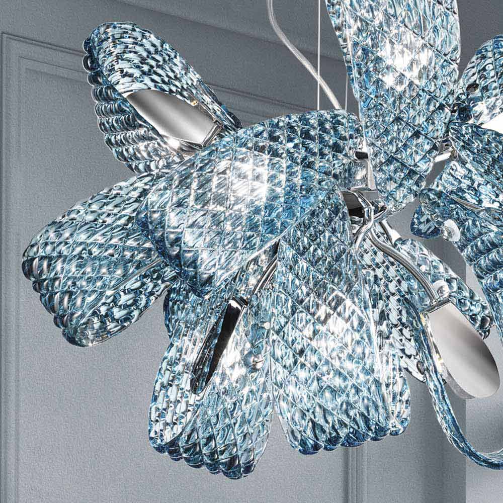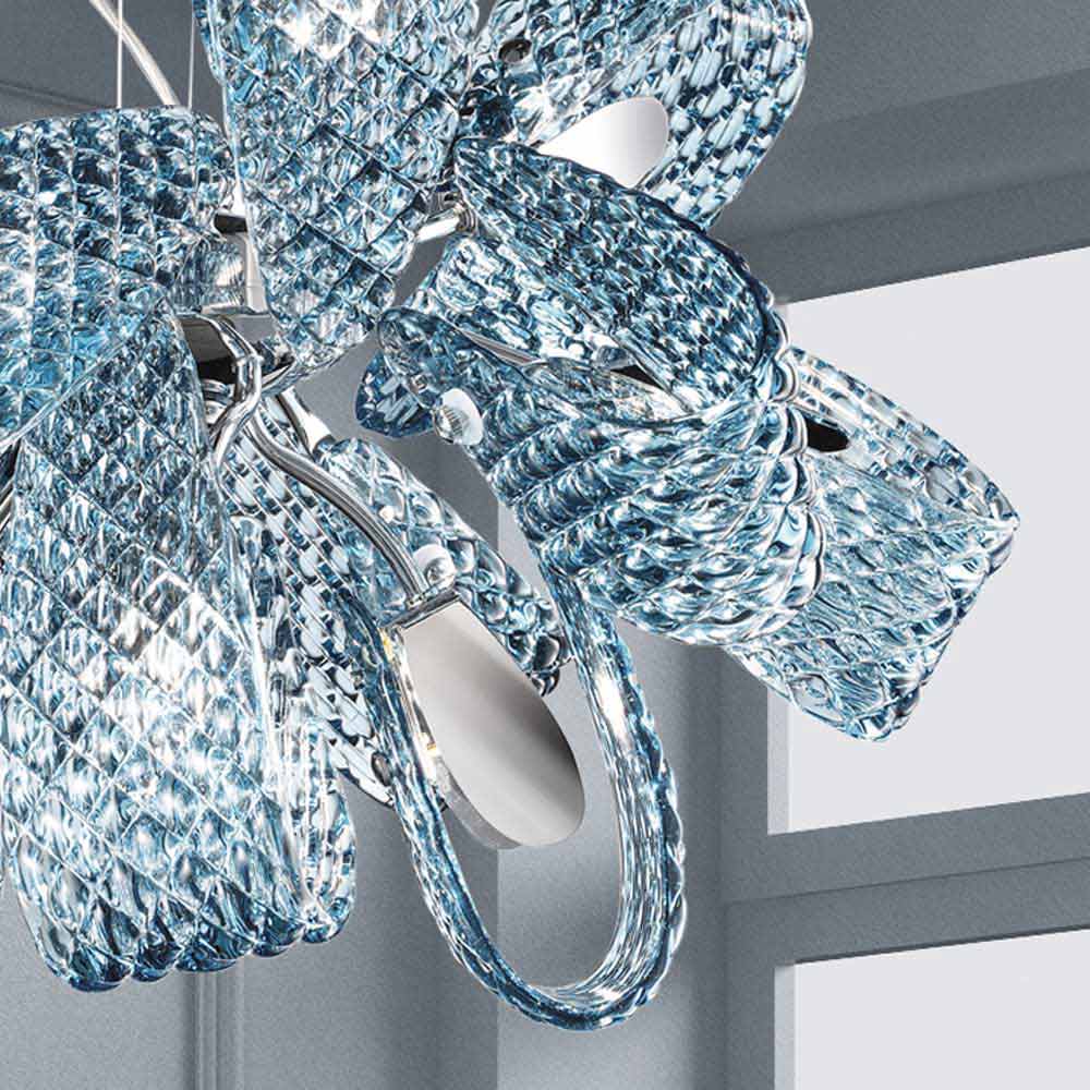 9 llambadarë dritash të punuara në Itali në Venecia me strukturë xhami të përfunduar blu dhe detaje prej metali të kromuar të lëmuar. Një ide e ndriçimit e përbërë nga shirita argëtues dhe tekstura të pazakonta që i japin origjinalitetin e saj estetik dhe një sens dinamizmi . Falë dizajnit të tij të çuditshëm dhe të rafinuar dhe futjeve metalike që krijojnë kontrast me xhamin, lind një llambadar ekskluziv , i aftë të karakterizojë çdo ambient me një prekje lehtësie, duke u dhënë jetë lojërave të mrekullueshme të dritës .