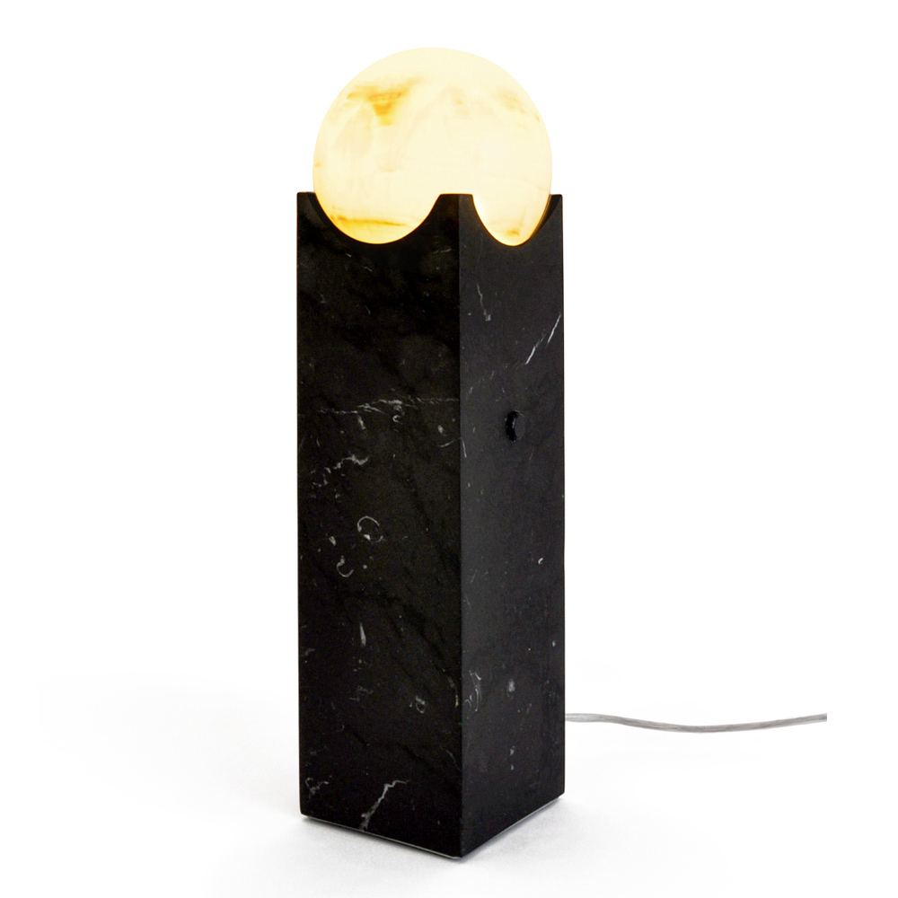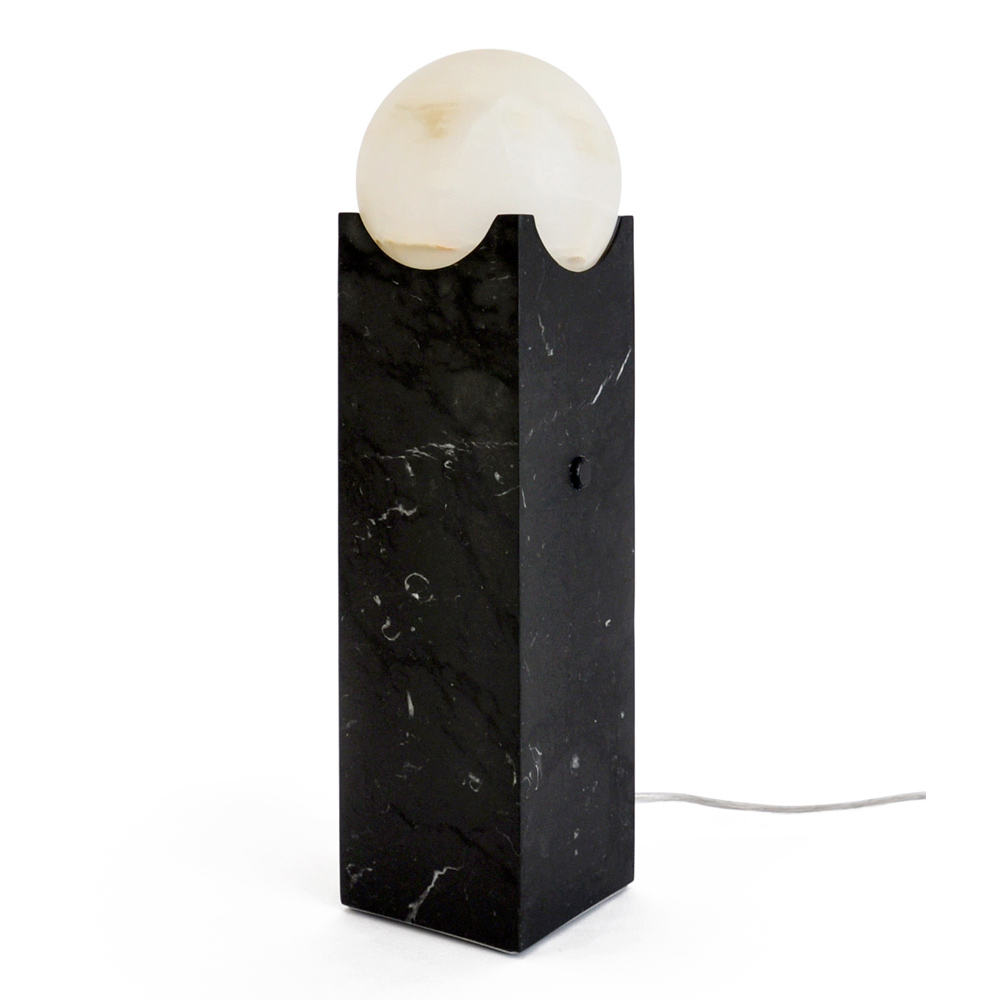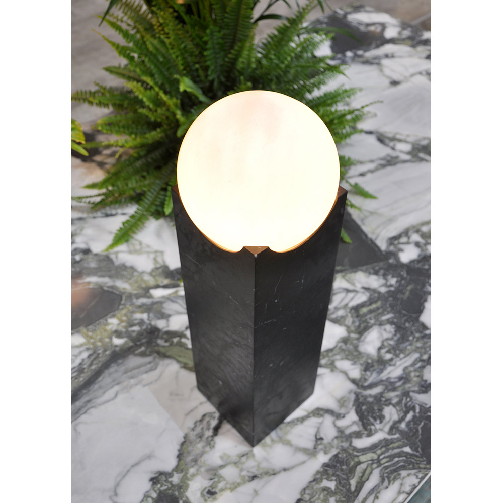 Kjo llambë tavoline përfaqëson një shkrirje midis madhështisë së mermerit të zi dhe pastërtisë së një sfere drite. Dizajni i guximshëm dhe modern krijon një kontrast vizual të fortë, por të ekuilibruar, perfekt për dekorin bashkëkohor të atyre që duan të rrethohen nga bukuria dhe luksi .
