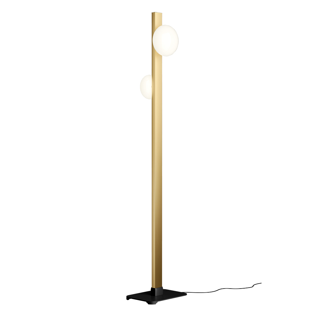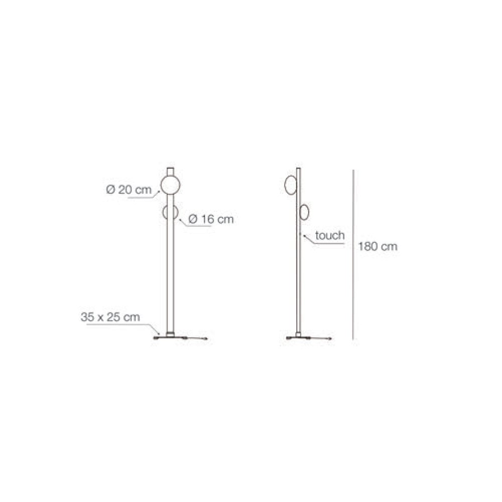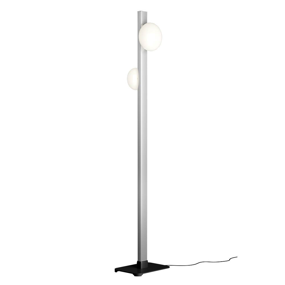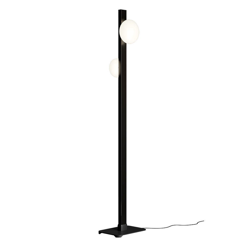 Kjo llambë dyshemeje është një ekuilibër i përsosur midis dizajnit skulpturor dhe elegancës funksionale , ideale për të pasuruar çdo hapësirë me një stil modern dhe të rafinuar . Struktura vertikale e hollë dhe gjeometrike përmban dy difuzorë sferikë prej qelqi opal , të cilët duken të pezulluar në ekuilibër të përsosur, duke dhënë një dritë të butë dhe mbështjellëse .