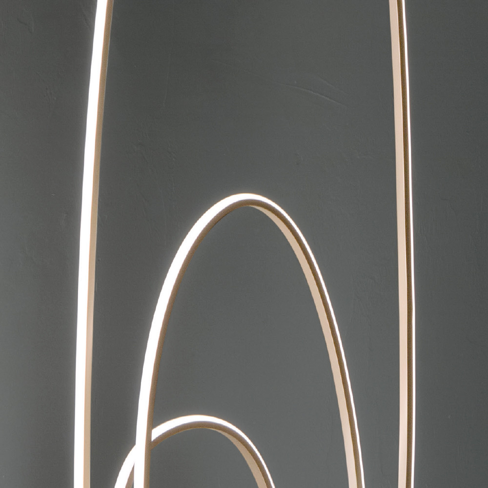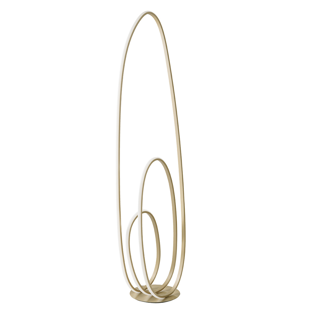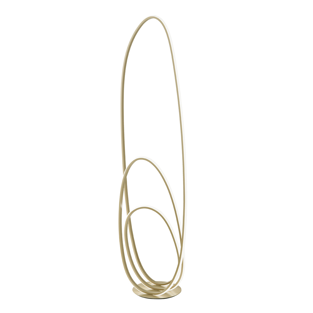 Llamba moderne e dyshemesë e bërë prej metali të lyer me ngjyrë ari me burim të integruar LED të errësueshëm. Një llambë dyshemeje me një dizajn modern dhe tërheqës, e konceptuar për të mobiluar dhe ndriçuar çdo hapësirë shtëpiake me një prekje origjinale dhe të rafinuar . Struktura e saj zhvillohet në një vorbull vertikale të përbërë nga një linjë e vazhdueshme që rikrijon rrathë eliptikë duke i dhënë jetë një stili të plotësimit veçanërisht të rafinuar dhe ekskluziv. Në gjendje të ofrojë ndriçim cilësor përmes një drite të ngrohtë dhe mikpritëse , kjo llambë dëshmon në të njëjtën kohë një element dekorativ i shkëlqyer i përsosur për ata që duan të pasurojnë shtëpinë e tyre me objekte ekskluzive të dizajnit.