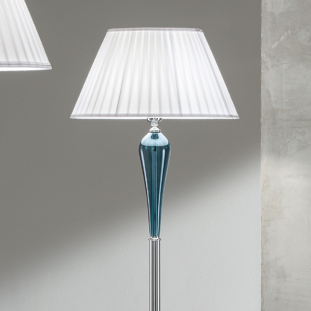 Ky llambë dyshemeje përbëhet nga një bazë në formë të rrumbullakët prej metali të kromuar, e zbukuruar me motive xhami transparente me ngjyra.