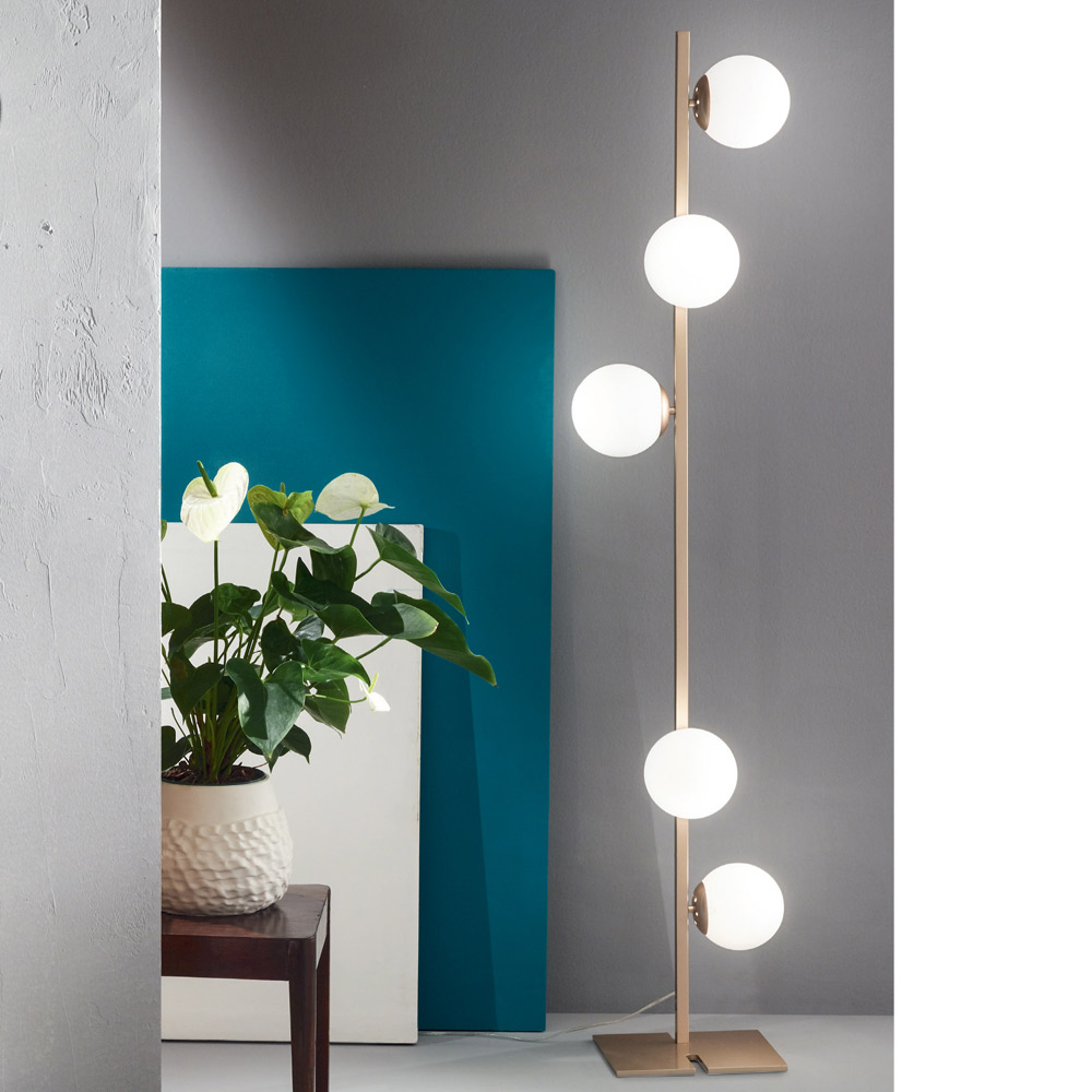 Llamba moderne e dyshemesë me strukturë metalike dhe difuzorë sferikë xhami me fryrje . Nga kombinimi perfekt i prekjes moderne të metalit dhe elegancës së përjetshme të xhamit të fryrë, lind një zgjidhje mobilimi origjinale dhe e rafinuar , e aftë për të pushtuar qendrën e vëmendjes në mjediset bashkëkohore të shtëpisë. Konformimi i tij që zhvillohet në një vijë vertikale e bën atë të përsosur për ndriçimin optimal të zonave të shtëpisë si dhomat e ndenjes, dhomat e gjumit, hyrjet apo kuzhinat e stilit modern, duke krijuar një atmosferë të ngrohtë dhe mikpritëse dhe duke kompletuar arredimin përreth me një prekje inovative dhe të rafinuar .