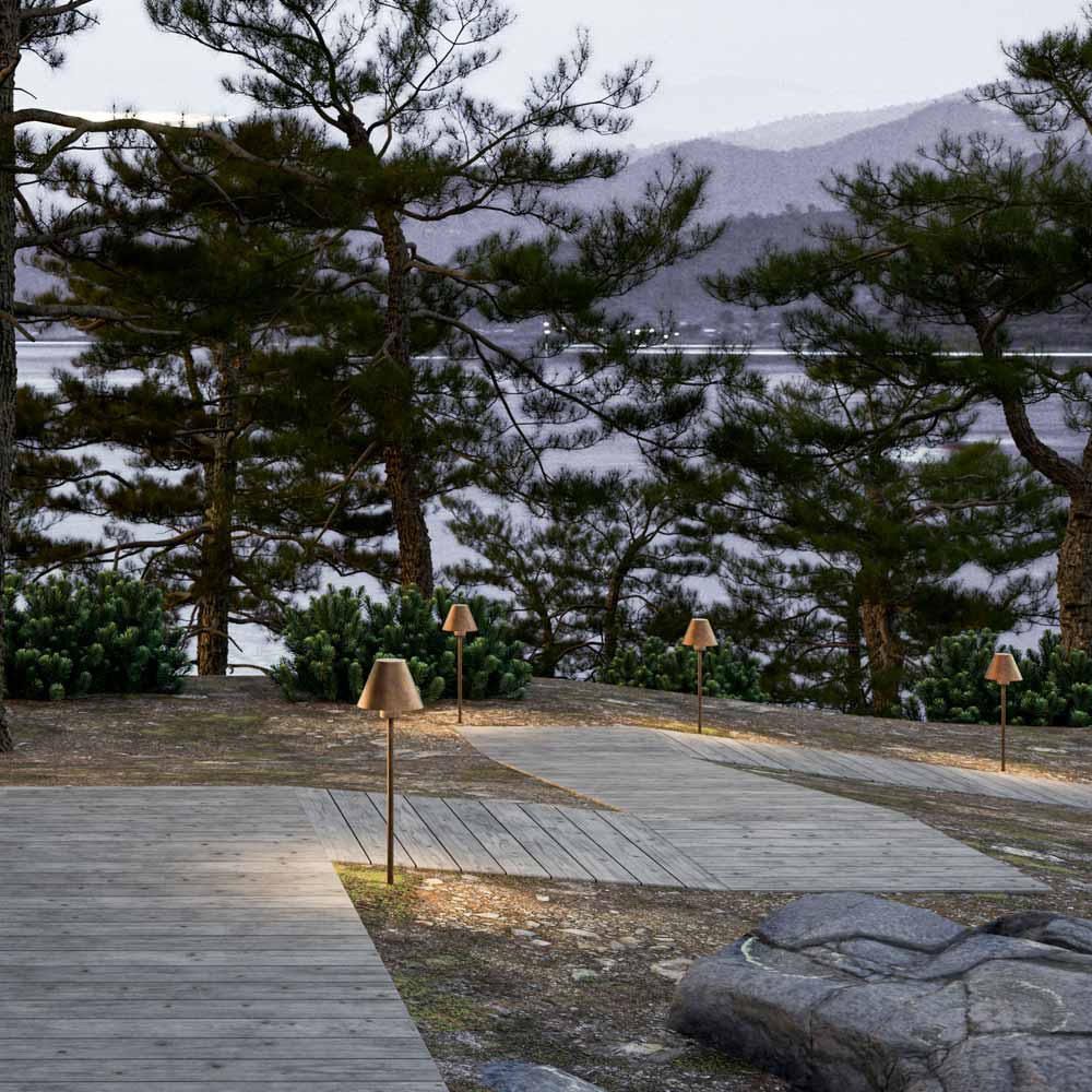 Koleksioni i llambave të jashtme ka lindur nga dëshira për të sjellë karakteristikat e dizajnit të brendshëm në produktet e destinuara për jashtë, për të krijuar atmosfera mikpritëse dhe familjare edhe në ajër të hapur. Me linja të frymëzuara nga estetika nordike, llambat e dyshemesë ose të murit janë prej bronzi dhe bakri.