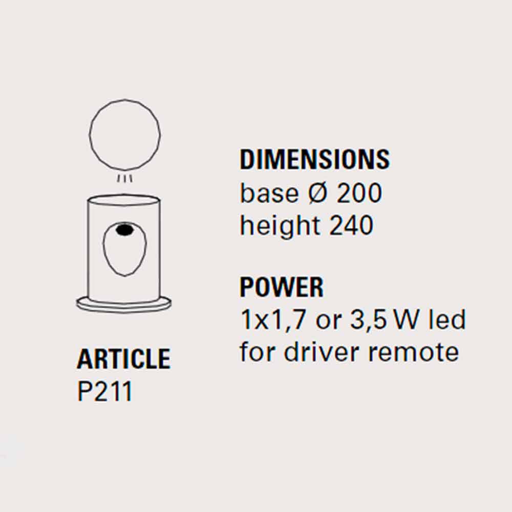 Dimensione : baza Ø200 x H 240 Sigurohet me llambë LED 115 1 x 1,7W IP 65, kënd prej 3000K prej 95 ° NB : shoferi i pa përfshirë