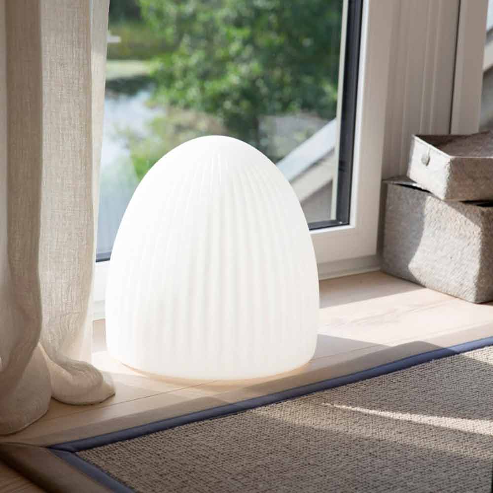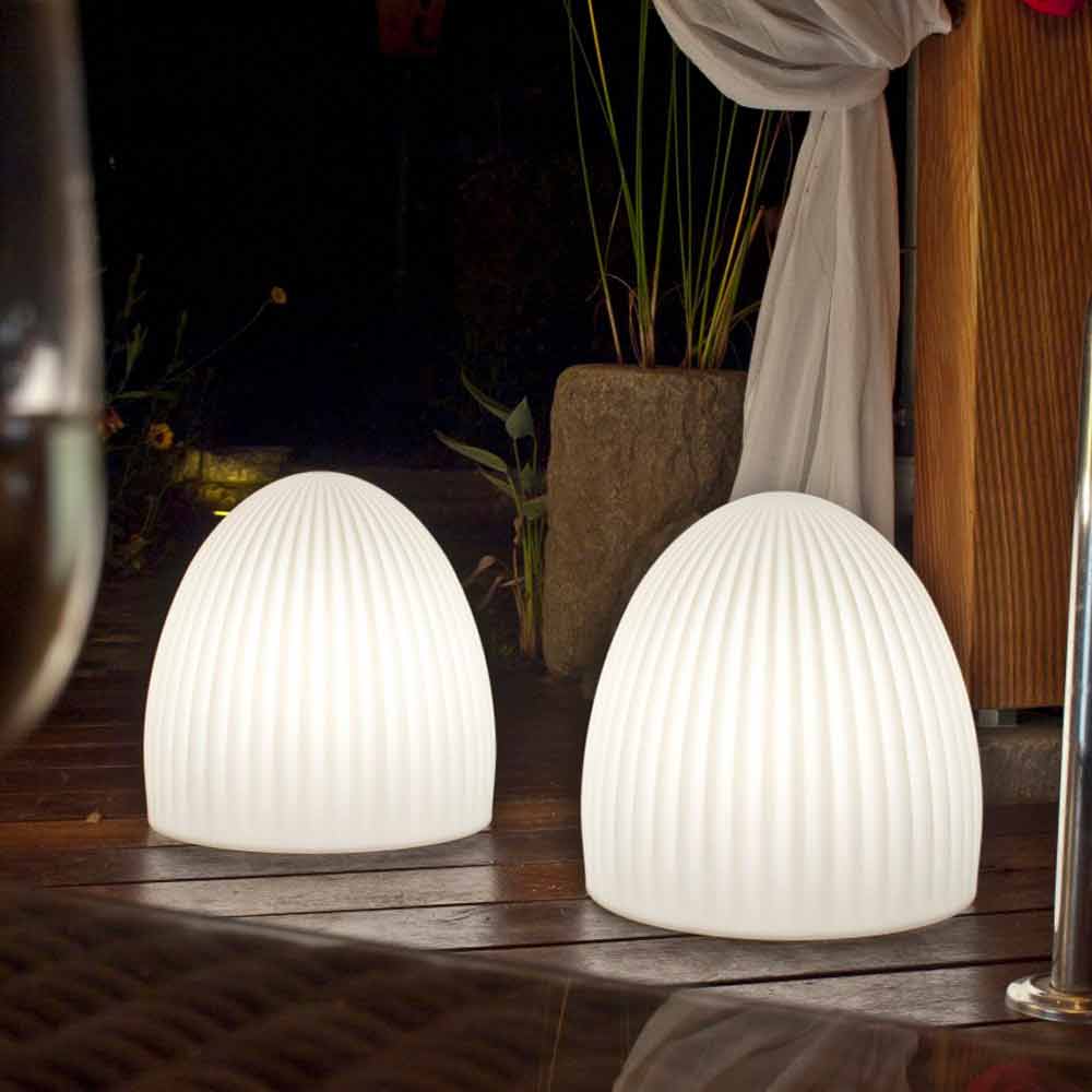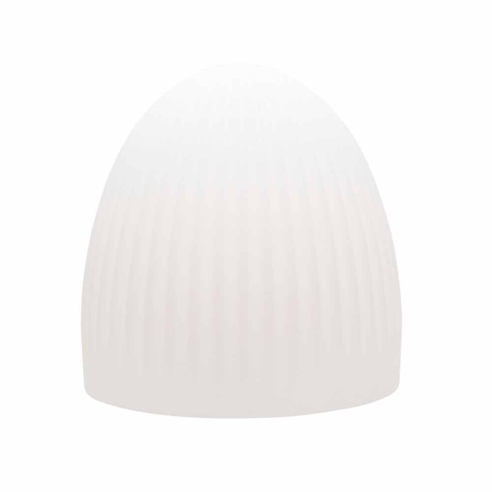 Llambë dyshemeje me dizajn modern në polietilen të bardhë për hapësira të brendshme ose të jashtme me lidhje LED, diellore ose E27.