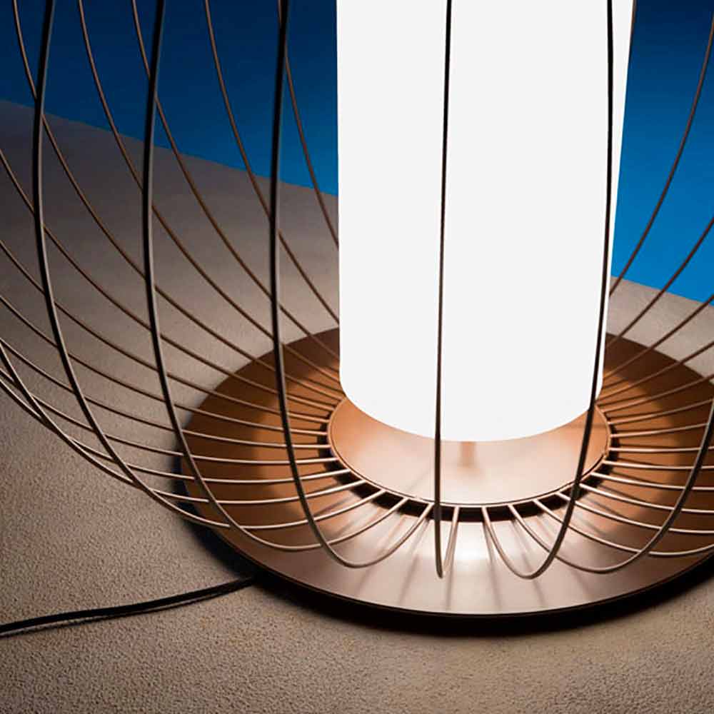 Kjo llambë tryeze origjinale dhe e veçantë ka një dizajn të frymëzuar nga fenerë që fluturojnë në qiell, duke ri-propozuar strukturën dhe frymën e saj falë linjave të saj të holla që sfidojnë ajrin e bërë nga tela metalikë, për një plotësim minimal me një karakter të fortë.