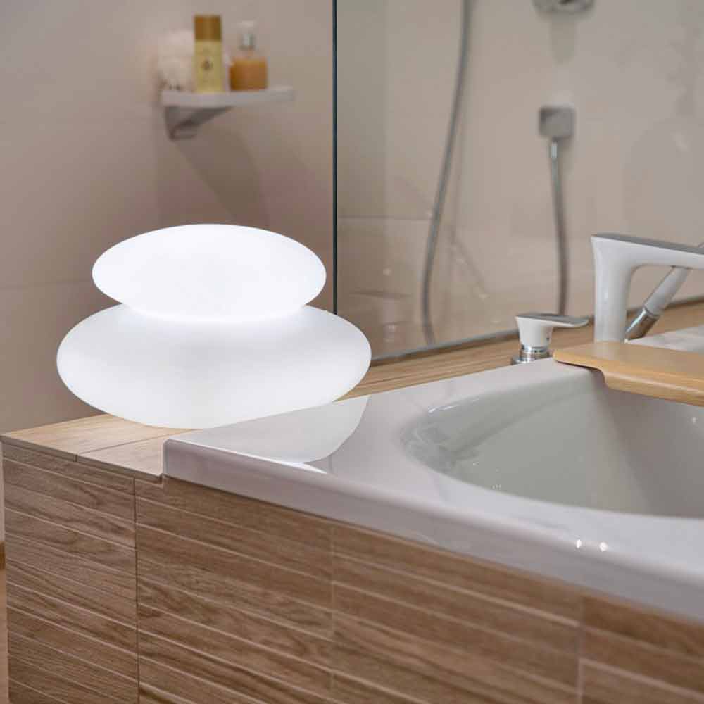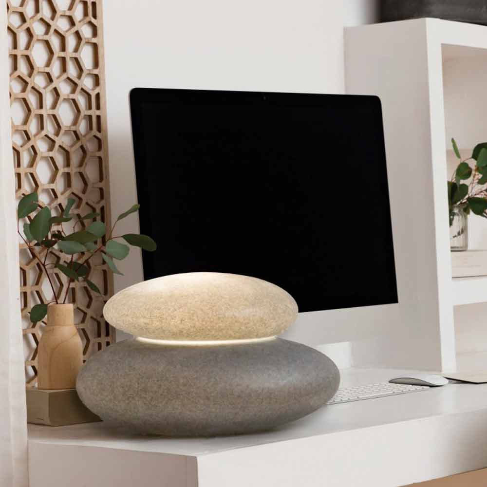 Llambë dyshemeje me dizajn modern në formën e një shkëmbi, me një zgjedhje të shtojcës dhe me ngjyra të ndryshme për brenda ose jashtë.