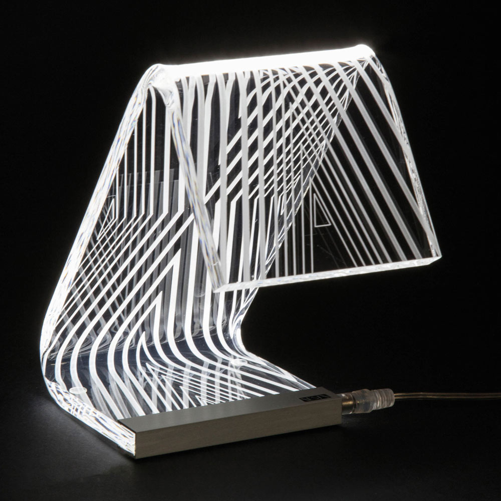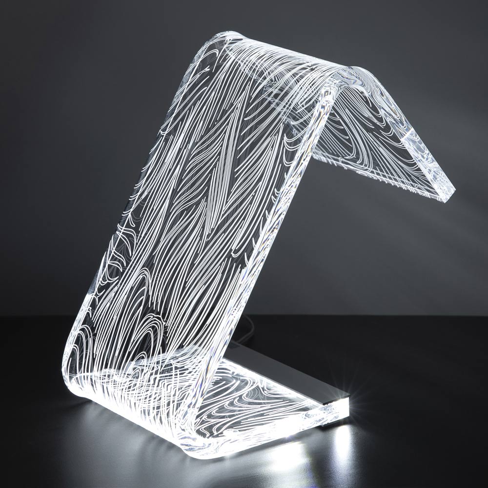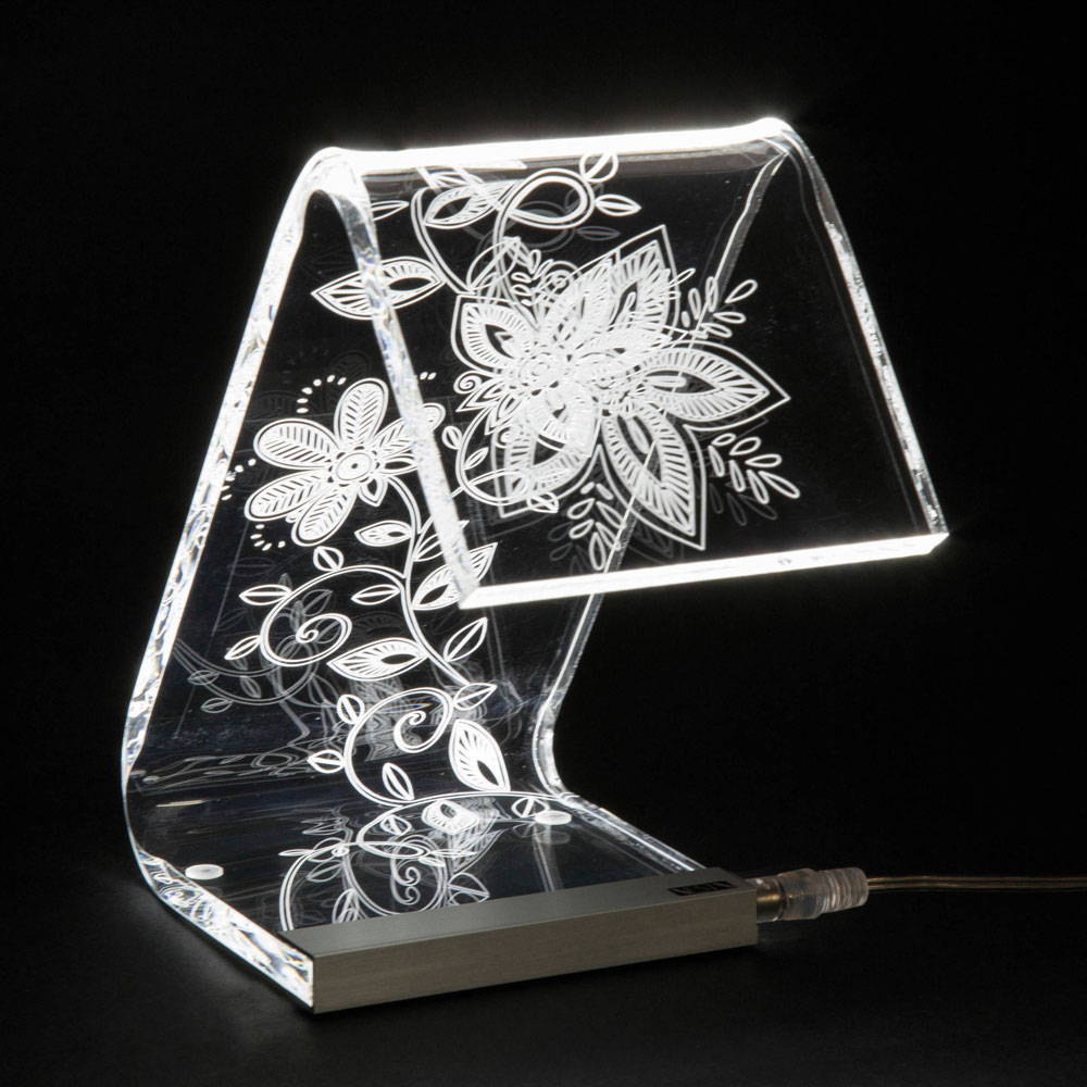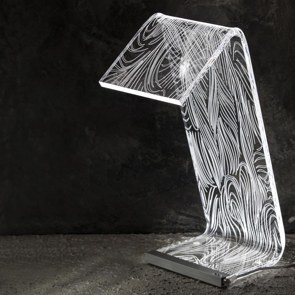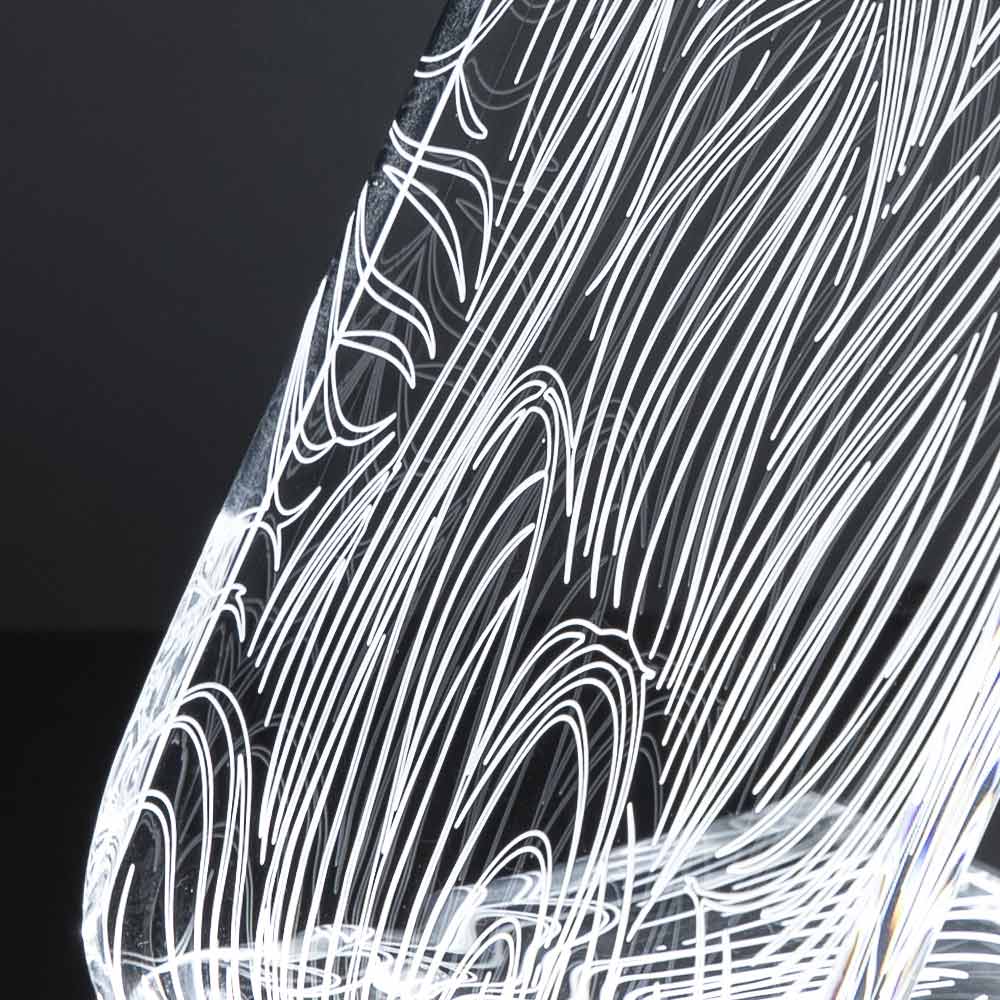 Llamba tavoline ne kristal akrilik transparent me dekorime laser, 2 permasa prodhim Italie.