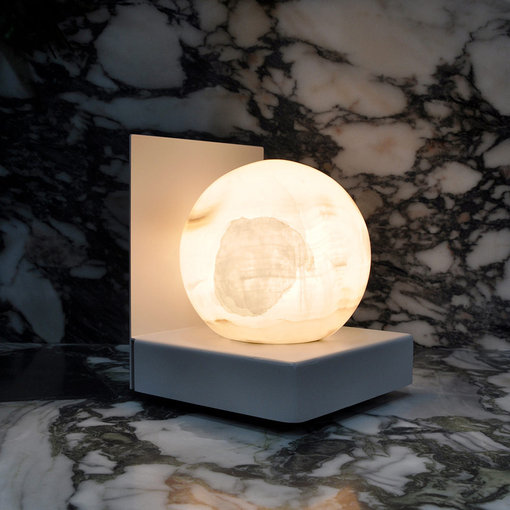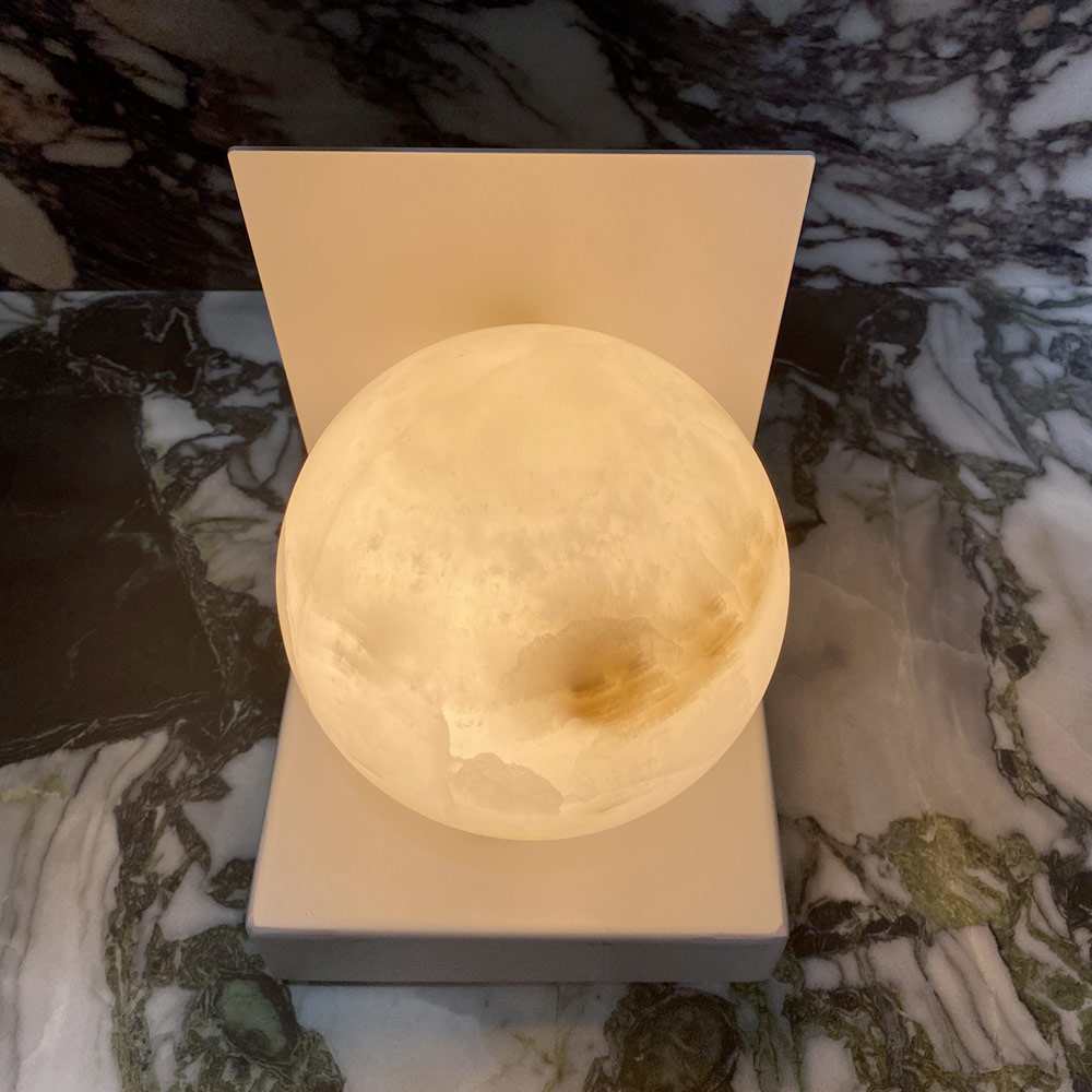 Kjo llambë me sferë mermeri është një deklaratë stili dhe ngrohtësie, e përkryer për ata që duan të shtojnë një atmosferë intime dhe mikpritëse në çdo ambient. Forma sferike në mermer të tejdukshëm lëshon një dritë të butë dhe të përhapur , duke projektuar modelet delikate të venave të tij natyrore në mure.