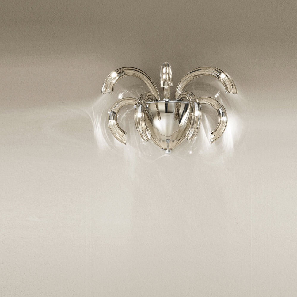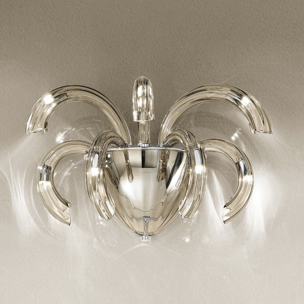 Llamba muri e punuar me dorë në Itali me xham Venecias, fundi i tymosur me detaje metalike të kromuar . Një estetikë tërheqëse që përshtatet me çdo lloj mjedisi në të cilin përshtatet me bollëk falë formave dhe funksionalitetit të dizajnit të tij. Krahët e lakuar të mrekullueshëm dhe elegantë zgjerohen nga jashtë për të sjellë dritë në drejtime të ndryshme dhe për të ndriçuar dhomën përmes një efekti skenografik origjinal që kujton shpërthimin e fishekzjarreve për një rezultat kreativ , të rafinuar dhe të fortë me ndikim vizual .
