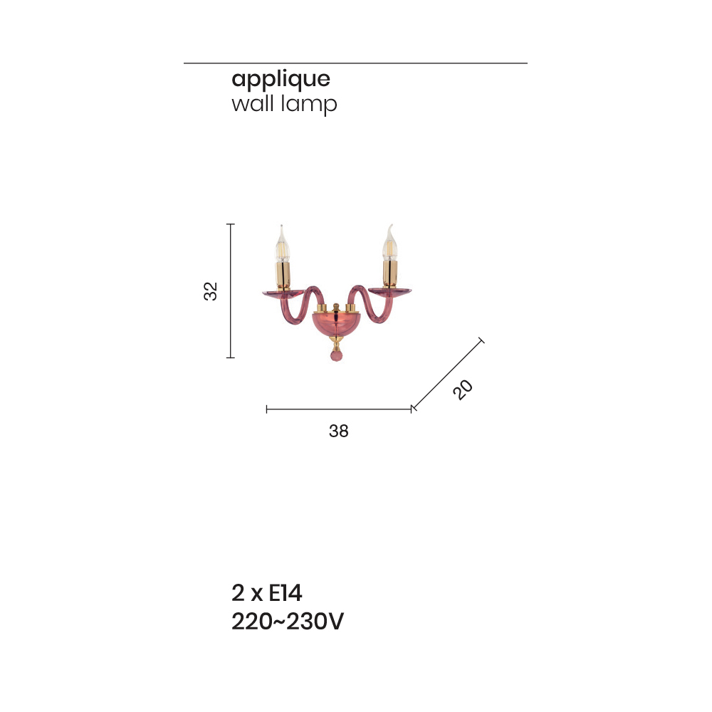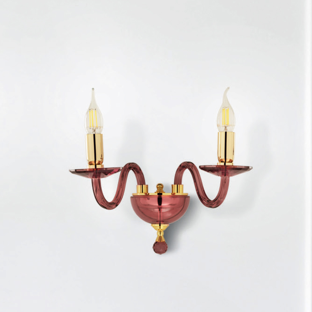 Kjo llambë muri e stilit klasik përbëhet nga 2 krahë me hark të bërë prej qelqi të punuar me dorë në Itali në fund të ngjyrës burgundy që mbështesin disqet që presin burimet e dritës.