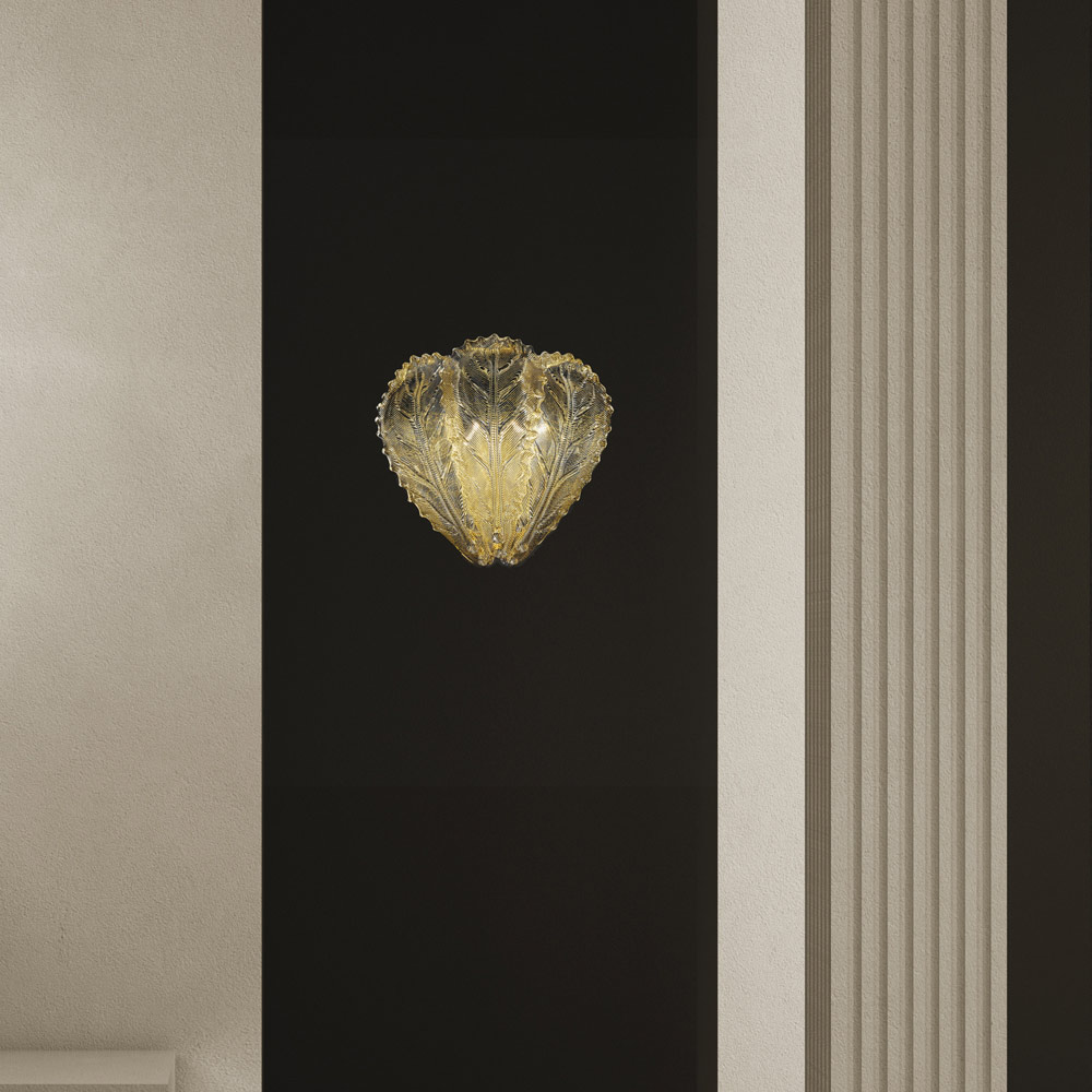 Llambë muri 2-drite e punuar me dorë prej xhami Venecias 24K ari me detaje metalike me shkëlqim të artë . Nga kombinimi perfekt i një frymëzimi elegant natyralist dhe një anë të fortë funksionale, lind një zgjidhje mobilimi që karakterizon çdo mjedis falë pranisë së tij ikonike, por në të njëjtën kohë të lehtë dhe të gjallë. Për të nënvizuar veçantinë e tij është puna e veçantë e nxehtë e cila lejon të nguliten damarët e gjetheve në sipërfaqen e xhamit për një rezultat ekskluziv dhe klas . Realizmi është i ngjyrosur me tone elegante që intensifikohen falë aplikimit të zhavorrit të qelqit ton-në-ton, duke sjellë në jetë një vepër të vërtetë arti.