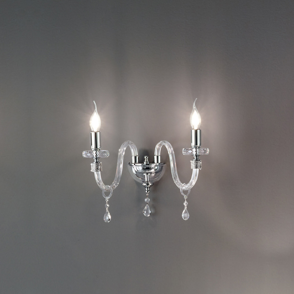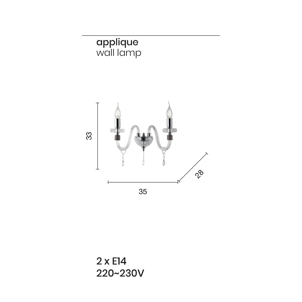Kjo llambë muri e stilit klasik përbëhet nga 2 krahë me hark të punuar me qelq transparent të punuar me dorë në Itali me efekt "rigaton", skajet e të cilave janë të rrethuara me shkëlqim të vendosur në metal, si dhe për pjesën qendrore të komplementit, ku dy tuba disqe rrethore mbështesin strukturën e ndërthurur me dy disqe rrethore të madhësive të ndryshme të bëra prej kristali të prerë.