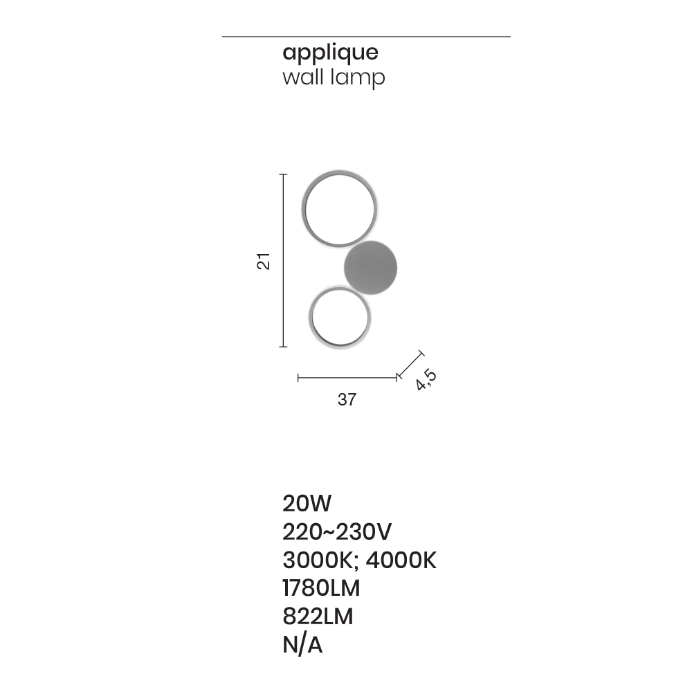 Llambë muri me strukturënë metal të lyer me ar, i kompletuar me burim LED që mund të zvogëlohet.Eleganca dhe origjinaliteti bashkohen në një kompozim modern të përbërë nga tre rrathë të madhësive të ndryshme të bashkuara dhe të mbuluara nga jashtë nga një shpërndarës i bardhë qumështi që mbyll shiritin LED, duke krijuar efekte të mrekullueshme të dritës në mure për një rezultat me një efekt të fortë skenografik. . Falë personalitetit të saj krijues dhe shpirtit të tij modern, ajo do të jetë në gjendje të ofrojë njëkohësisht një ndriçim cilësor dhe një element dekorativ unik të aftë për të pasuruar muret e shtëpisë me një prekje ekskluzive . Mobilje me karakter të gjithanshëm , e cila mund të instalohet në çdo ambient shtëpiak si në hyrje, kuzhinë, dhomë ndenjeje apo dhomë gjumi.