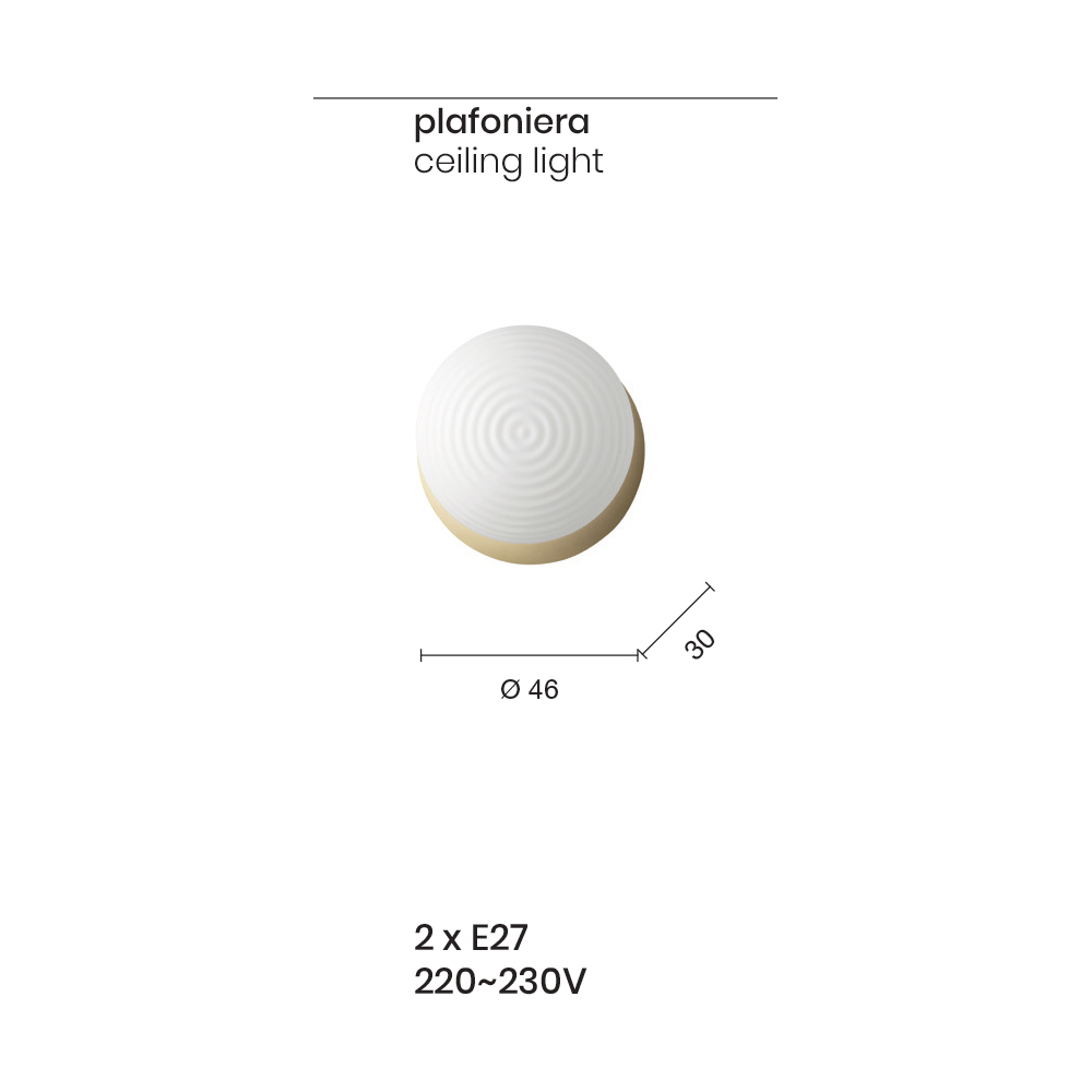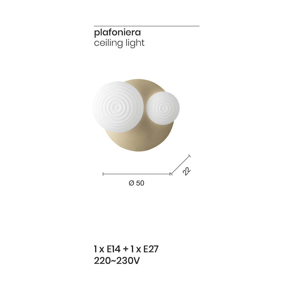 Llamba tavani me konstruksion metalik te lyer dhe difuzer xhami i fryre . Një komplement me përmasa të vogla, i aftë për të pasuruar ambientet e shtëpisë ose të kontratës me një stil bashkëkohor me personalitet. Dizajni i tij karakterizohet nga forma të rrumbullakëta dhe të përkulura që krijojnë një harmoni të mrekullueshme dhe një efekt të rëndësishëm vizual . Kombinimet e mrekullueshme të përfundimeve të propozuara plotësojnë estetikën përfundimtare të produktit duke i dhënë atij një prekje unike dhe të rafinuar falë kombinimit të përsosur midis modernitetit të metalit dhe elegancës së xhamit të fryrë. Konformiteti i tij lejon gjithashtu që të instalohet në mur si një dritë praktike e murit duke e bërë atë edhe më funksional dhe duke rritur vlerën dhe vlerën e tij.