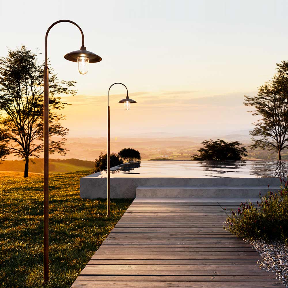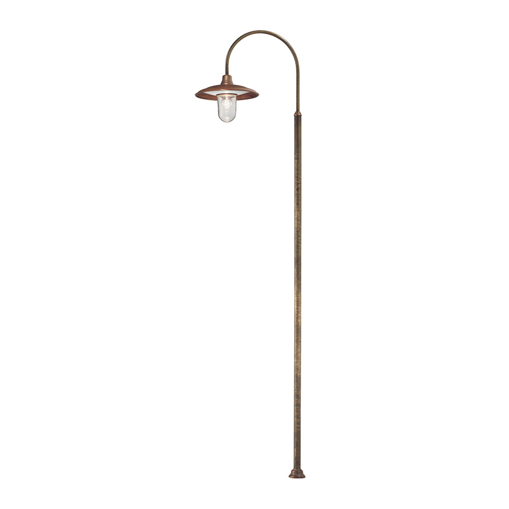 Llambë rruge në natyrë e punuar me kornizë bronzi antike, kokë antike bakri dhe xham transparentProdhuar tërësisht në Itali. Në llambat e koleksionit Chiocciola, prej hekuri, bronzi ose bakri antik, theksi vihet tek funksionaliteti. Të frymëzuar nga arti i dobët, ato kanë forma të pastra, të lira nga çdo artificialitet. Koleksioni përbëhet nga llamba varëse, llamba muri, drita tavani dhe llamba kopshti.