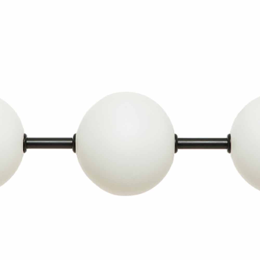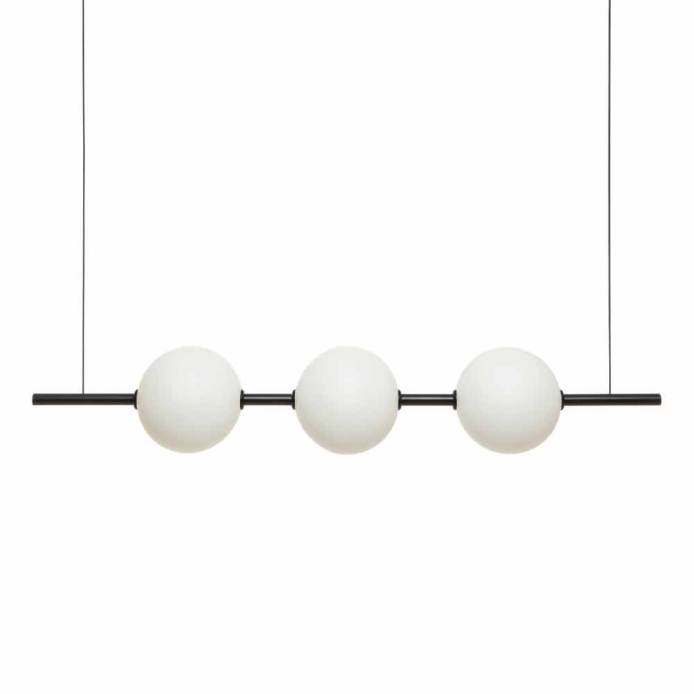 Llambë e varur në bronz të zi ose të krehur me tre sfera qelqi borosilikat, prodhuar në Itali.
