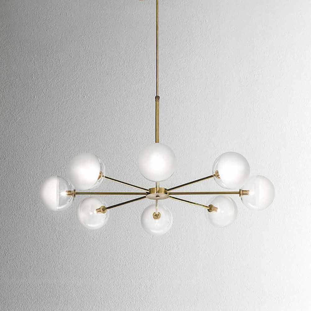 Kjo llambë e varur në ambiente të brendshmepërmban një dizajn elegant dhe të rafinuar , i bërë prej bronzi natyrorme sfera qelqi transparente dhe me rërë. Sipas kërkesës, gjithashtu i disponueshëm në version në sfera antike prej bronzi ose xhami të pikturuar në të zezë dhe të veshur me bakër. Isshtë një mobilje me një vlerë të madhe emblematike dhe një ekuilibër perfekt midis estetikës dhe funksionalitetit.
