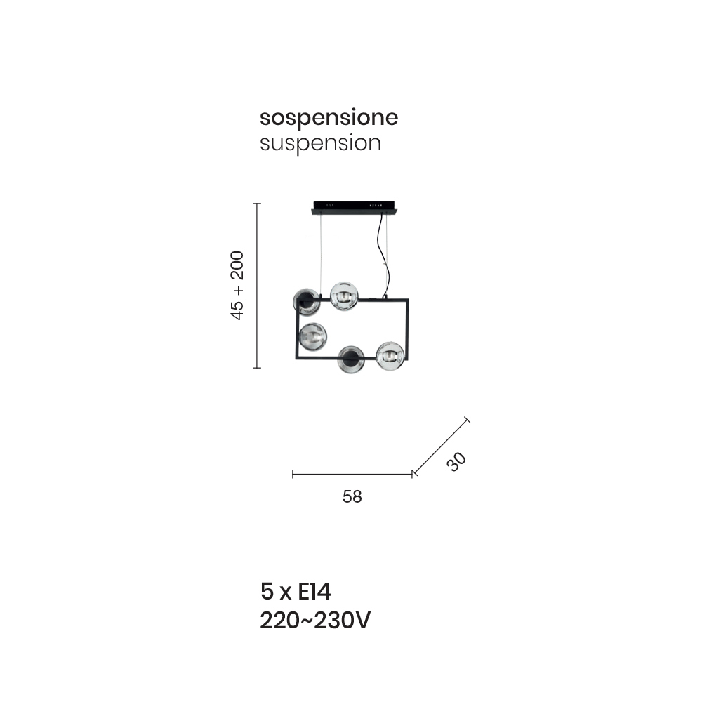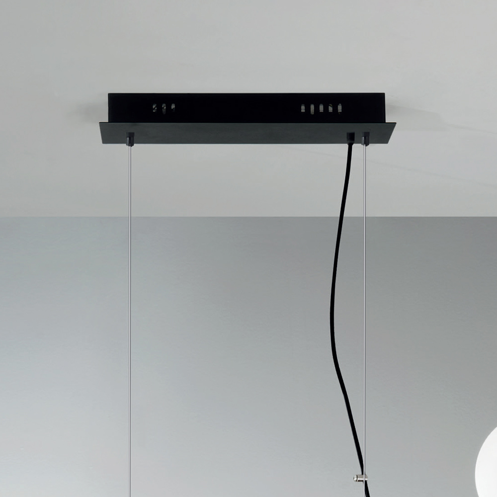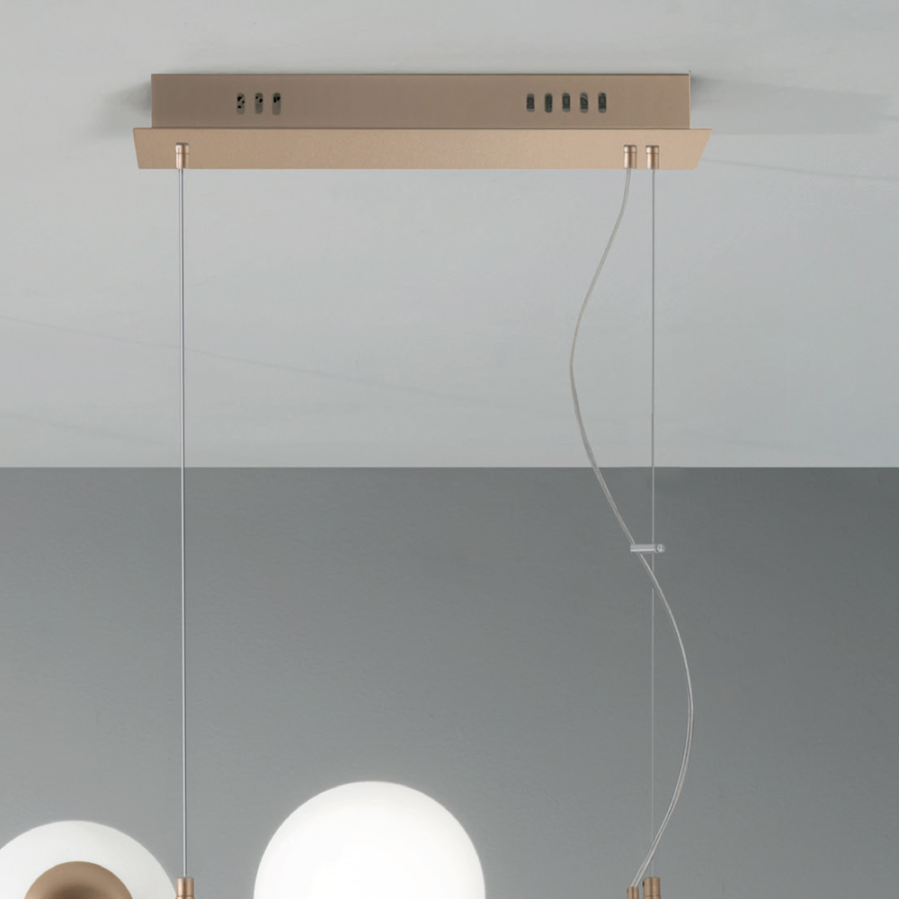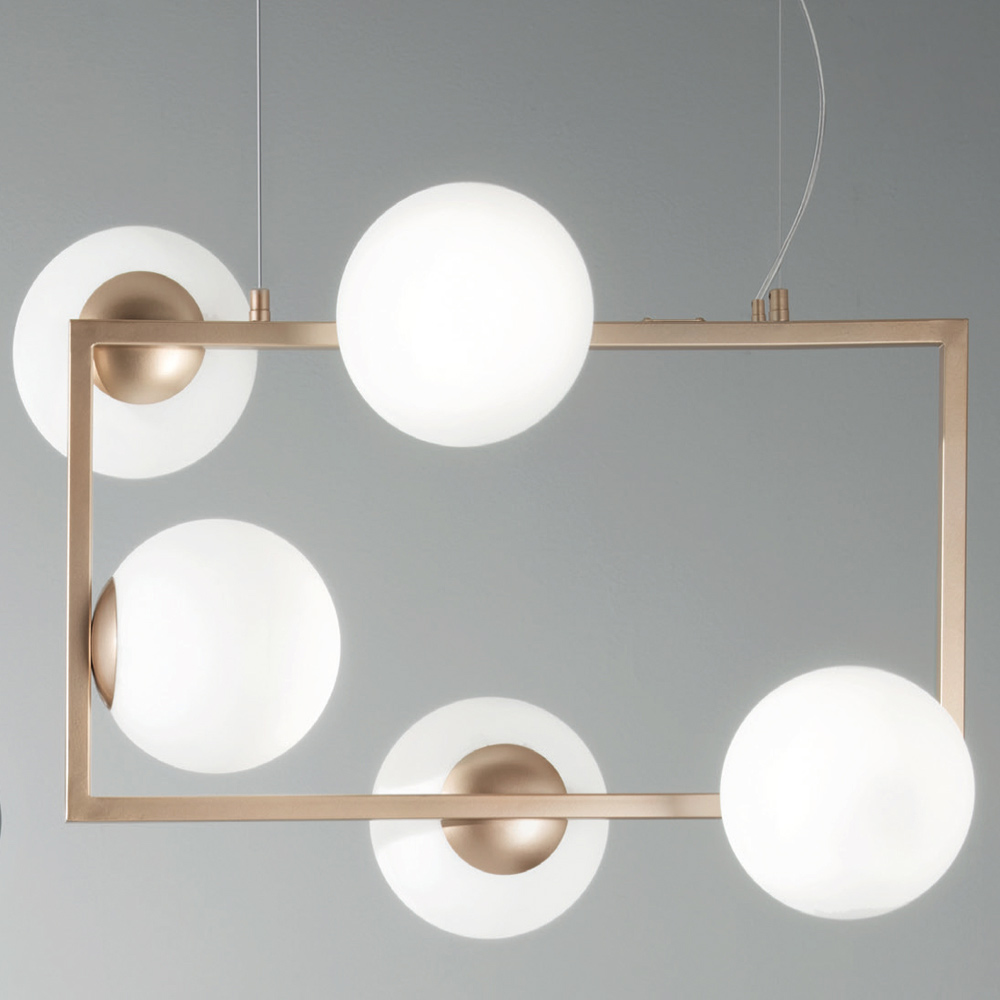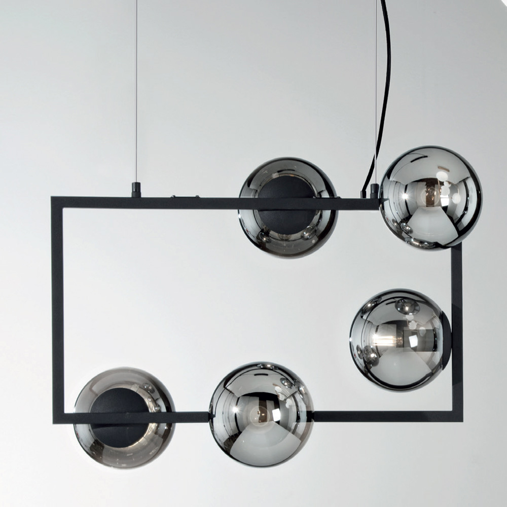 Llambë pezullimi me strukturë metalike dhe difuzorë sferikë të qelqit me fryrje të kompletuar me kabllo të rregullueshme në lartësi. Nga kombinimi perfekt i prekjes moderne të metalit dhe elegancës së përjetshme të xhamit të fryrë, lind një zgjidhje mobilimi origjinale dhe e rafinuar , e aftë për të pushtuar qendrën e vëmendjes në mjediset bashkëkohore të shtëpisë. Konformimi i tij e bën atë të përsosur për zona të veçanta të shtëpisë si dhoma e gjumit, dhoma e ndenjes ose tavolina juaj në dhomën e ngrënies ose kuzhinës ku ofron ndriçim optimal dhe me cilësi të lartë .