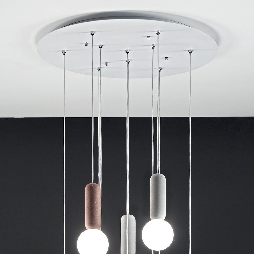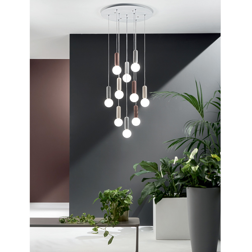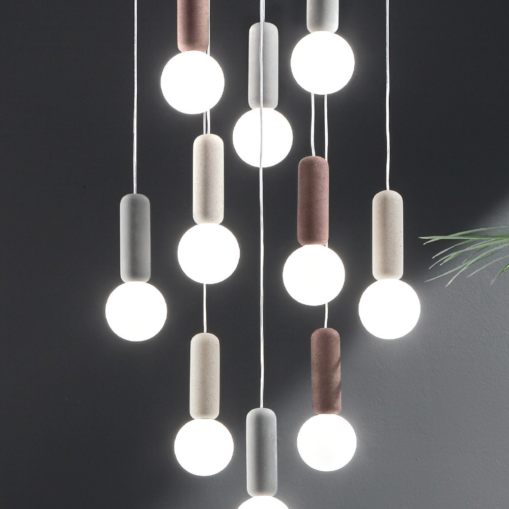 Llamba e varur me 6 ose 10 drita me strukture prej betoni dhe abazhur te rrumbullaket ne xham te bardhe saten e kompletuar me kabllo te rregullueshme ne gjatesi. Një kombinim i pazakontë dhe kreativ i materialeve dhe përfundimeve që sjell në jetë një zgjidhje mobilimi sa ekscentrike aq edhe elegante dhe moderne. Nuancat e mrekullueshme të ngjyrave të zgjedhura për komponentët e betonit përzihen në mënyrë të përkryer me përfundimin delikat dhe romantik të abazhurëve të xhamit për një rezultat me një estetikë të sofistikuar dhe një ndikim të fortë vizual . Konformimi i tij që zhvillohet në një dizajn vertikal e bën atë një ide të përsosur mobilimi për të ndriçuar dhomat e ngrënies, dhomat e ndenjes, kuzhinat ose dhomat e gjumit me një shije bashkëkohore, duke i dhënë ambientit një prekje të stilit unik .