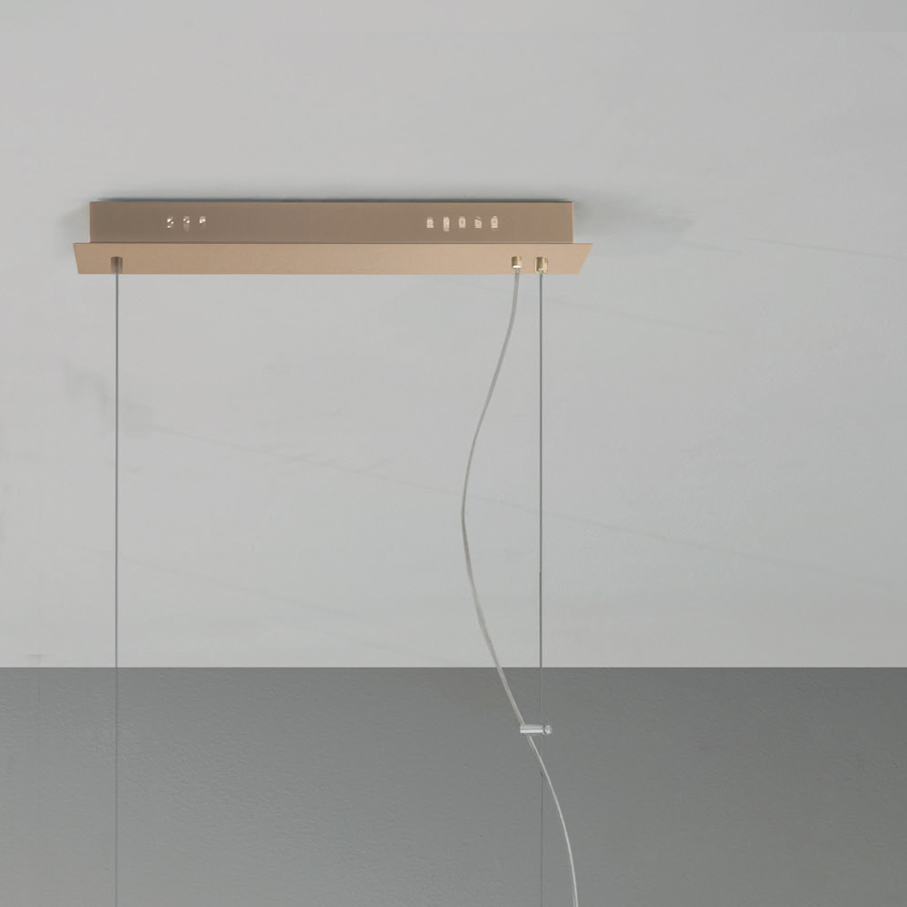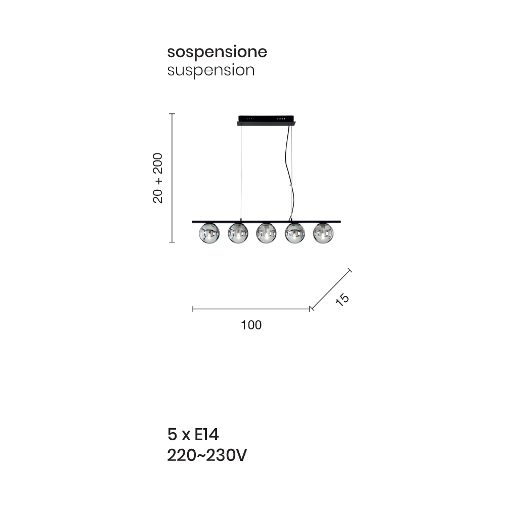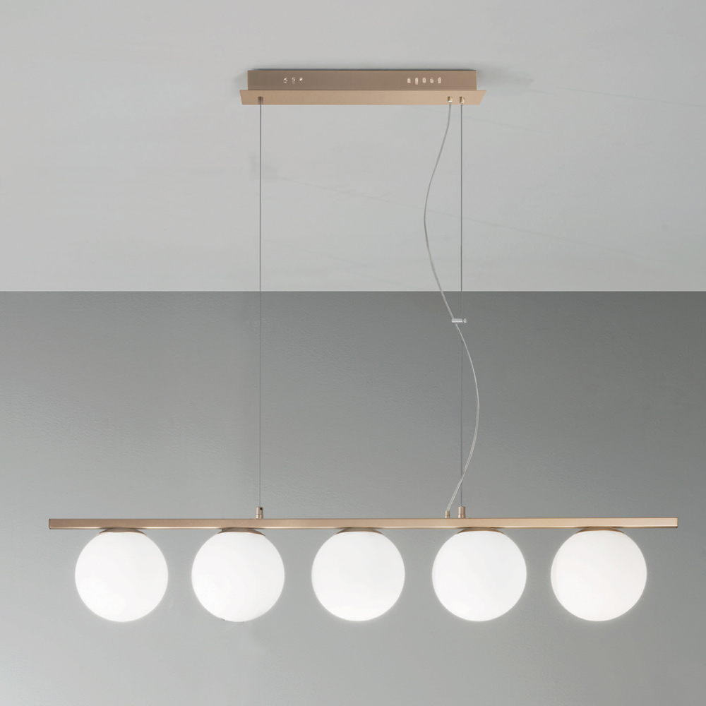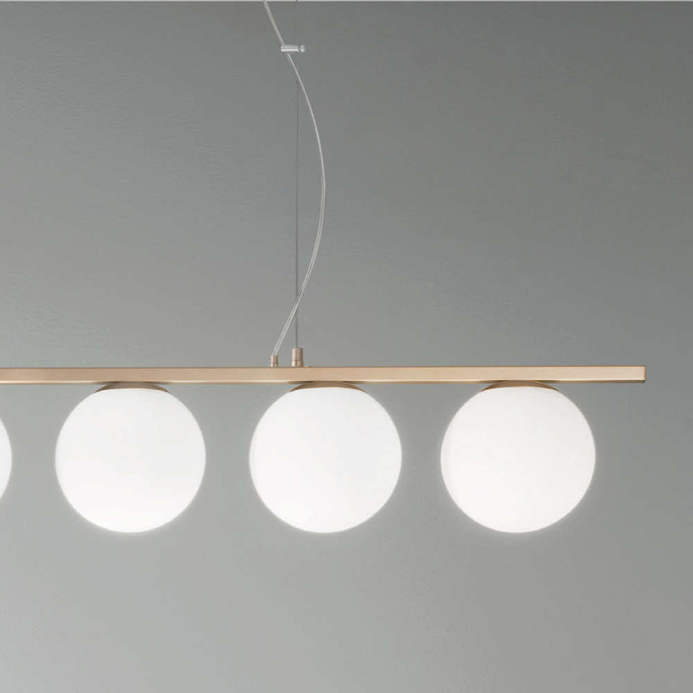 Llambë pezullimi me strukturë metalike me fije ari dhe difuzorë sferikë të xhamit me fryrje të kompletuar me kabllo të rregullueshme në lartësi. Nga kombinimi perfekt i prekjes moderne të metalit dhe elegancës së përjetshme të xhamit të fryrë, lind një zgjidhje mobilimi origjinale dhe e rafinuar , e aftë për të pushtuar qendrën e vëmendjes në mjediset bashkëkohore të shtëpisë. Struktura e saj zhvillohet në një linjë të vetme që e bën atë një zgjidhje veçanërisht të përshtatshme për ndriçimin e tryezës tuaj brenda dhomës së ngrënies ose kuzhinës.