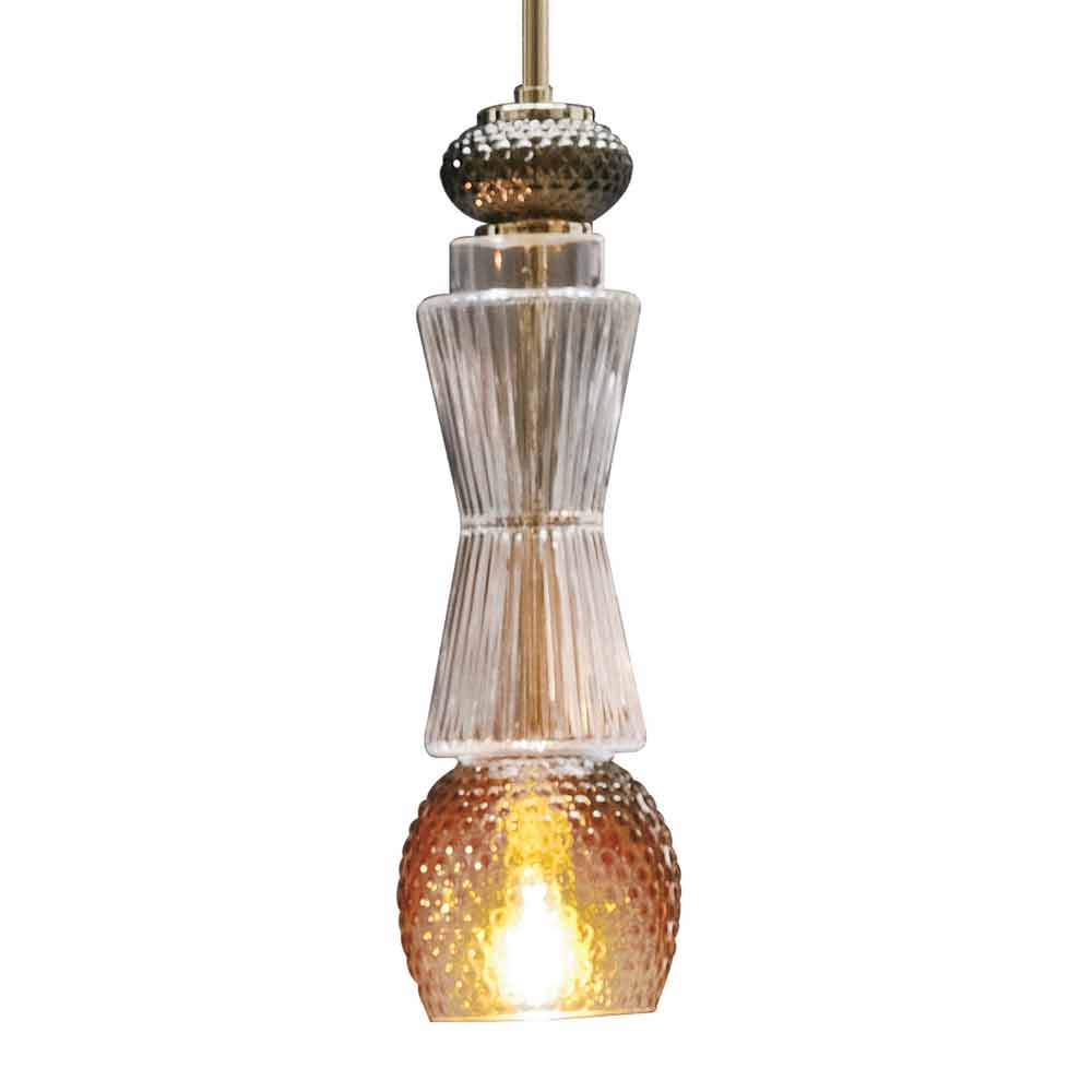 Llambë e varur në xham Murano me detaje të arta dhe kabllo pëlhure, prodhuar në Itali.