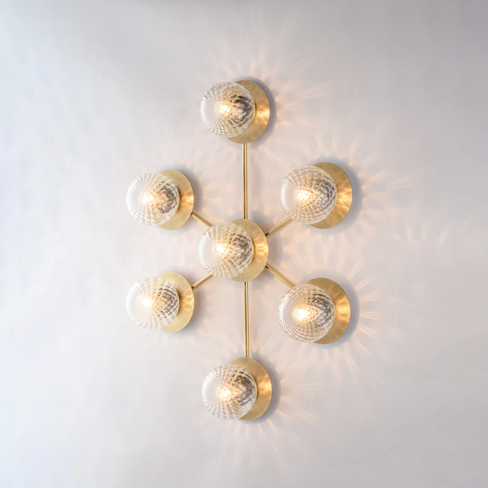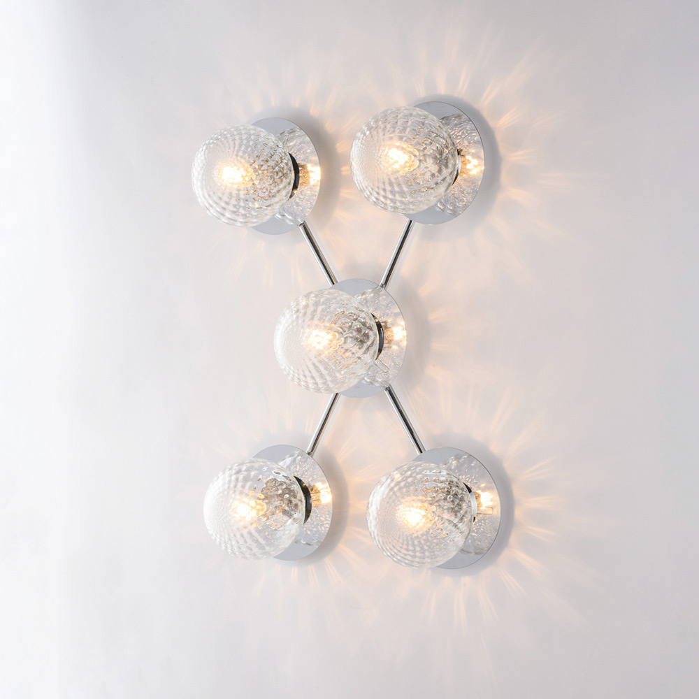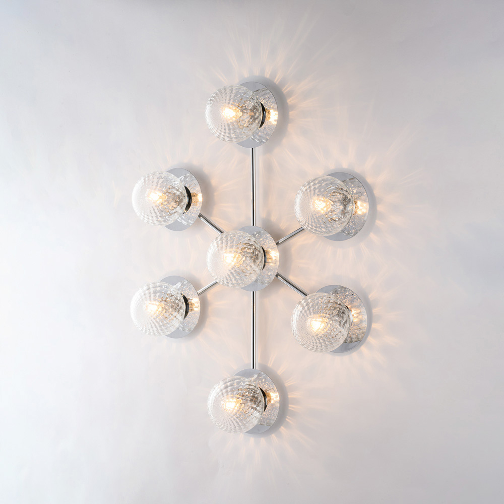 Dramatike dhe bashkëkohore, kjo dritë tavani prej hekuri e punuar me dorë dallohet për përbërjen e saj dinamike dhe moderne. Struktura e degëzuar përmban difuzorë sferikë prej qelqi, të rregulluar në një model të ekuilibruar, duke krijuar një lojë sugjestive drite dhe reflektimesh që thekson tavanin dhe ndriçon në mënyrë uniforme dhomën.