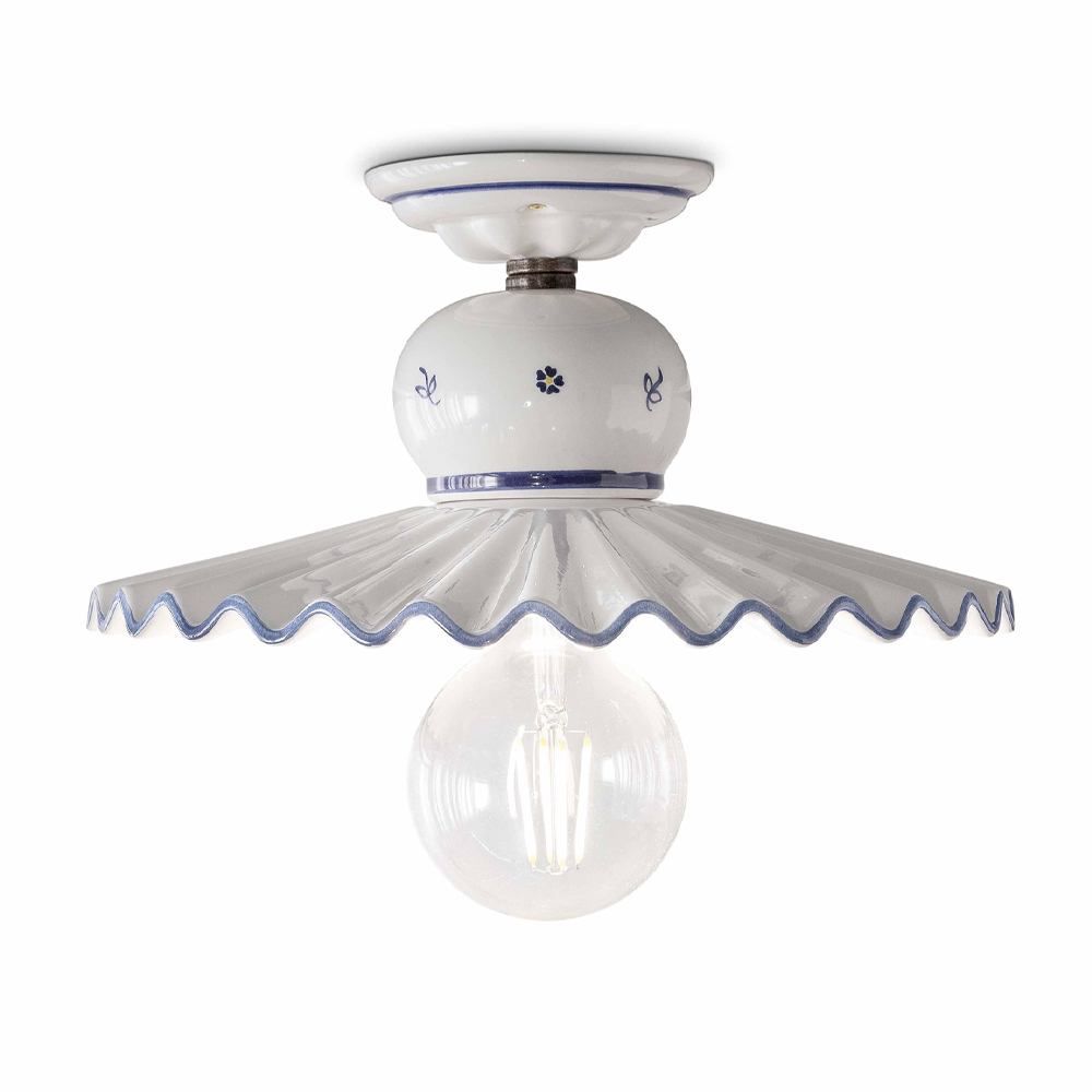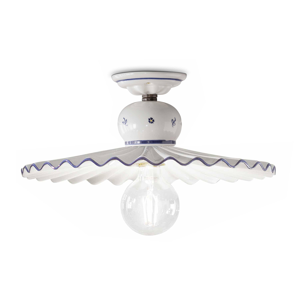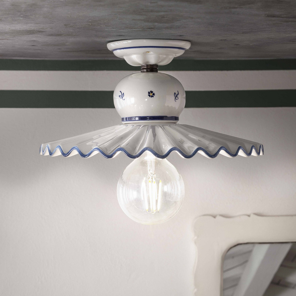 Kjo llambë tavani është tërësisht e punuar me dorë në metal dhe qeramikë me dekorim të lyer me dorë ,për të nxjerrë në pah aftësitë dhe aftësitë manuale të artizanëve. Dizajni karakterizohet nga stili i vendit dhe detajet romantike tipike të fshatit italian që mobilojnë dhoma të ndryshme me freski.