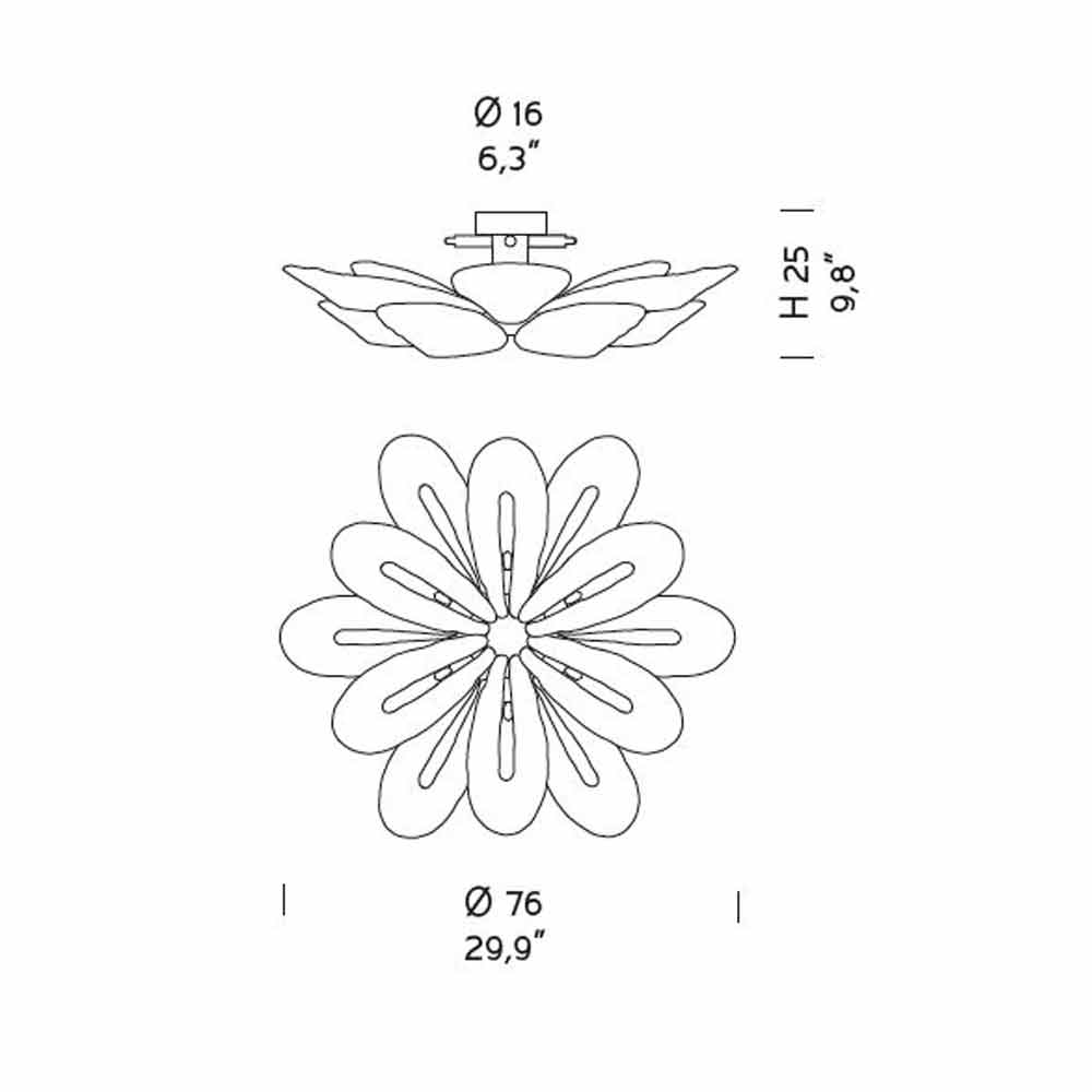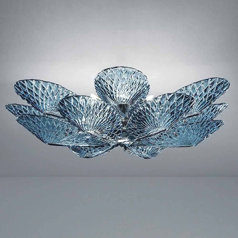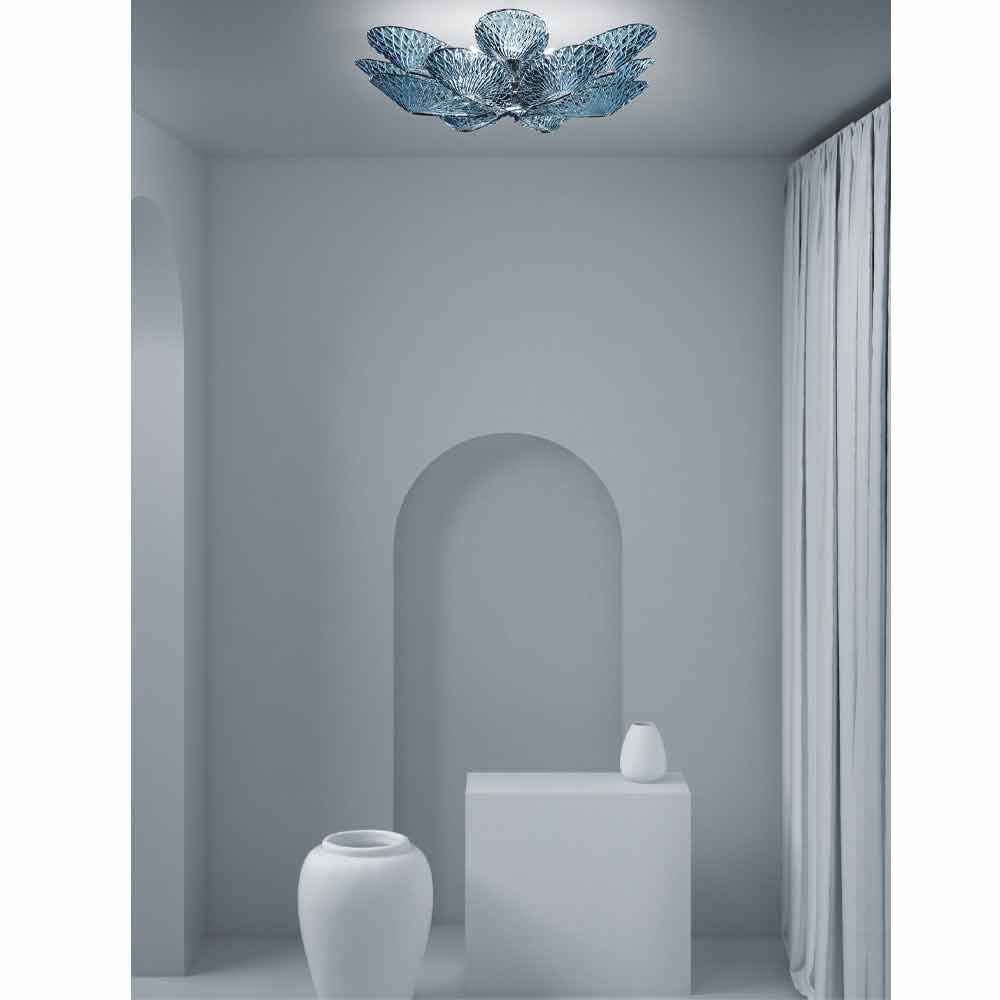 Llambë tavani e rafinuar e punuar me dorë në Itali në Venecia në xham me ngjyrë blu me detaje në metal të kromuar të lëmuar . Shiritat delikatë dhe elegantë të qelqit bashkohen së bashku për t'i dhënë jetë një pike të ndritshme të aftë për t'u kombinuar me hapësirat bashkëkohore dhe për t'i dhënë karakter mjediseve më klasike. Një zgjidhje e gjithanshme mobilimi e karakterizuar nga modeli i veçantë i diamantit që mbulon të gjithë sipërfaqen, duke krijuar ndezje të shumta për lojëra të pazakonta dhe ekskluzive të dritës.