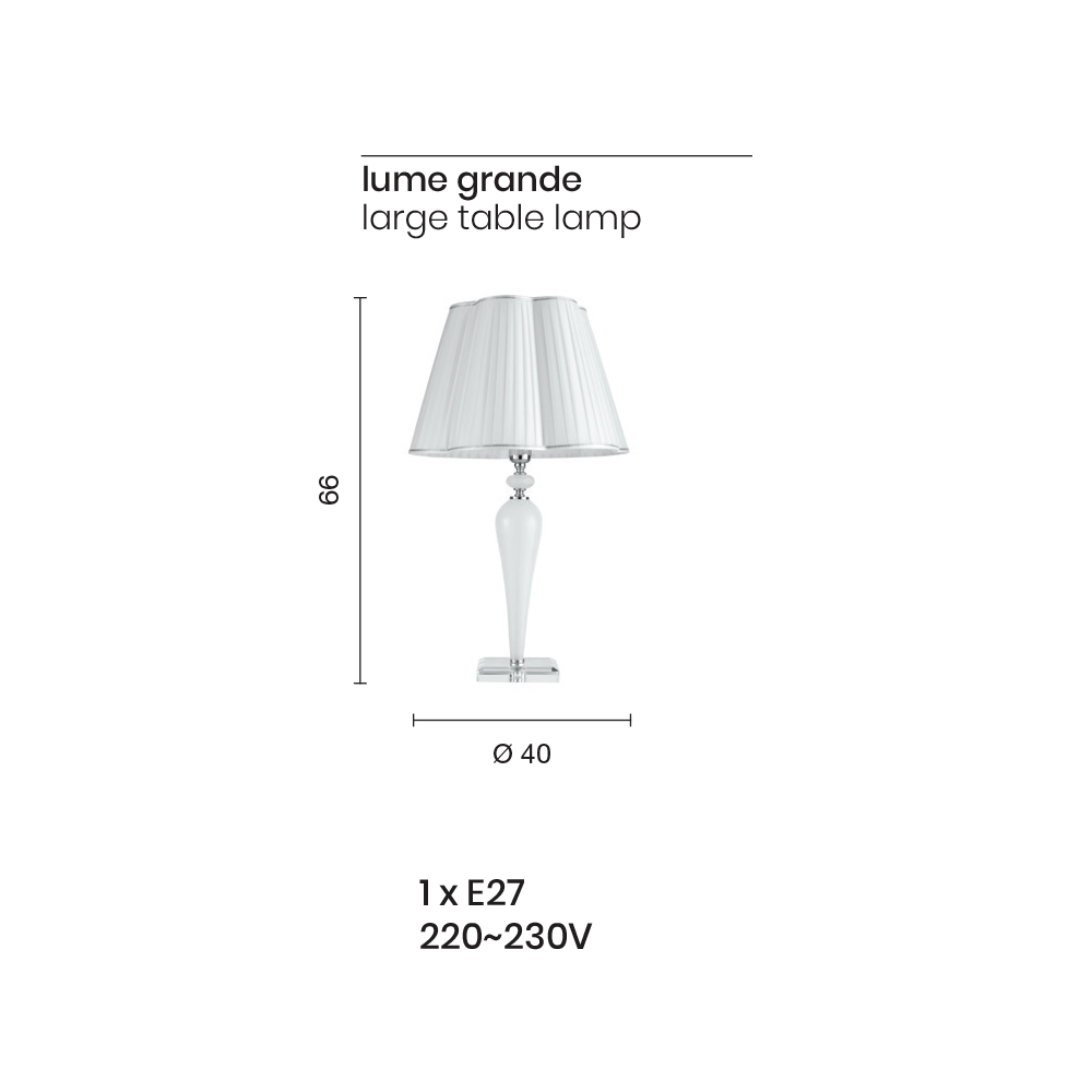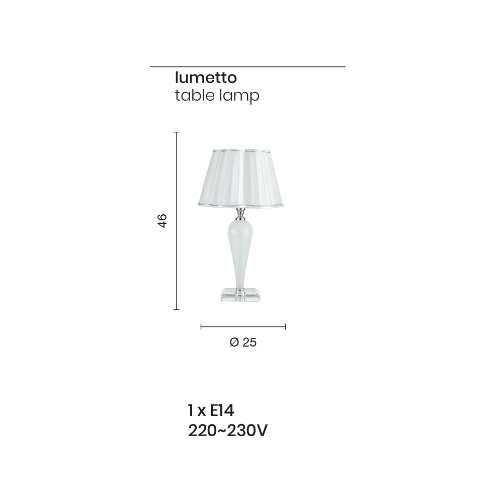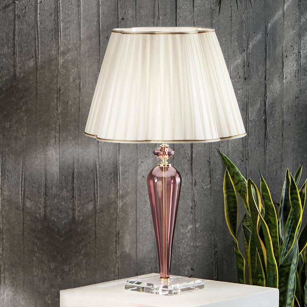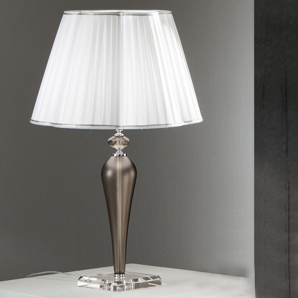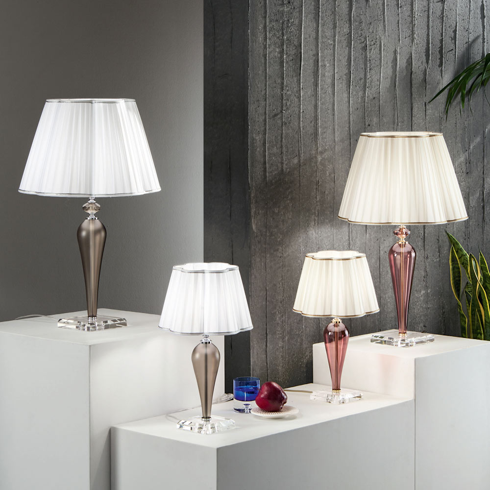 Kjo llambë tavoline ka një dizajn klasik, të rafinuar dhe elegant të përbërë nga një bazë e bërë nga elementë kristal dhe në formë cilindrike të prodhuara në xhami të punuar me dorë që formojnë strukturën e llambës. Detajet e vogla dhe mbulesa e mbajtëses së llambës janë prej metali të kromuar ose të artë ; ndërsa abazhuri margaritar është në pëlhurë të bardhë me finitura argjendi ose floriri.