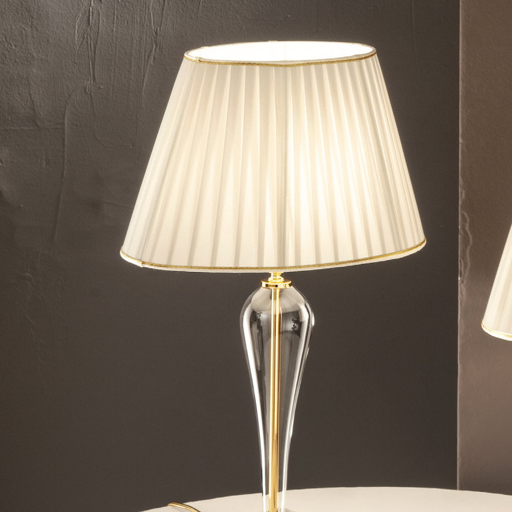 E bërë me një bazë kristali transparent dhe një element në formë cilindrike në xhami transparent të punuar me dorë, detajet e vogla dhe mbulesa e mbajtëses së llambës janë prej metali të artë ; abazhuri, megjithatë, është në pëlhurë të palosur me përfundime ari.