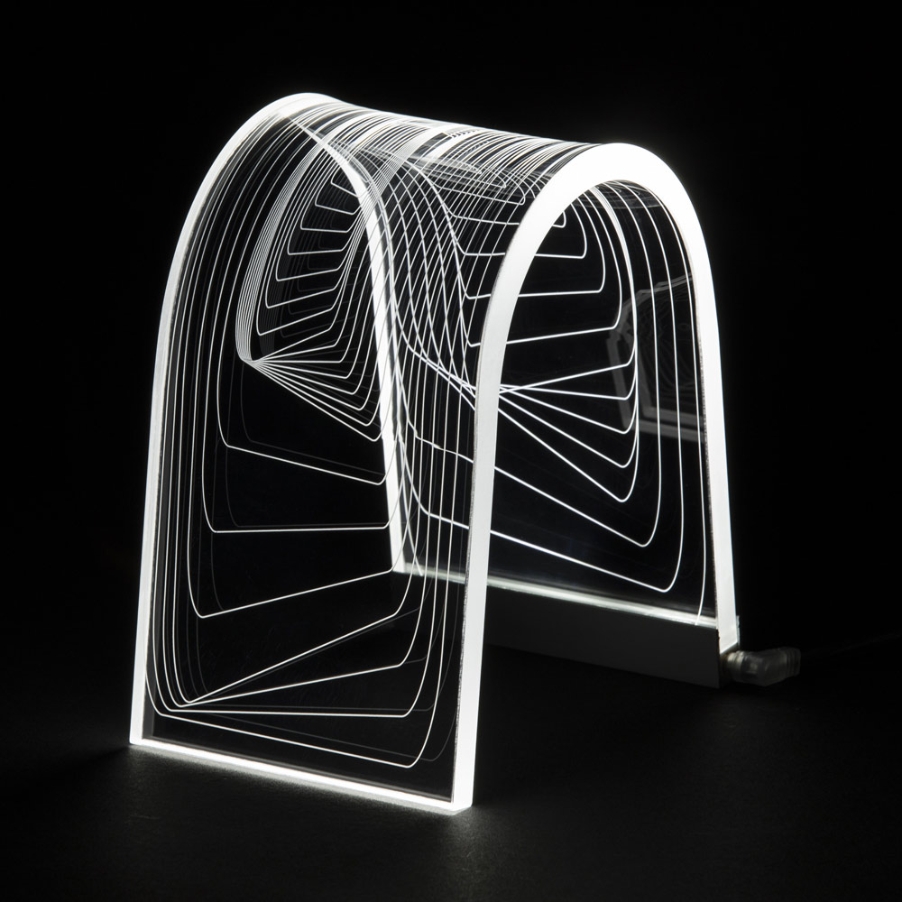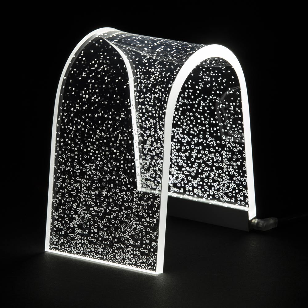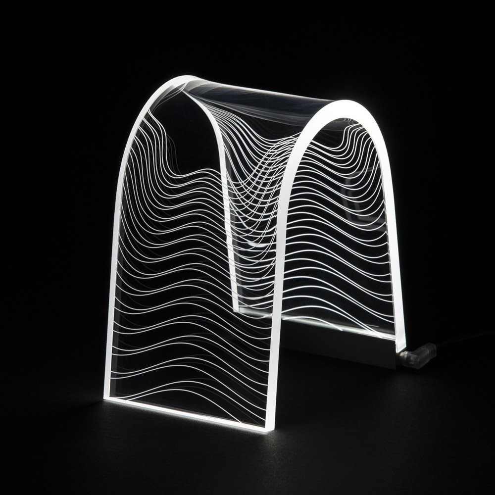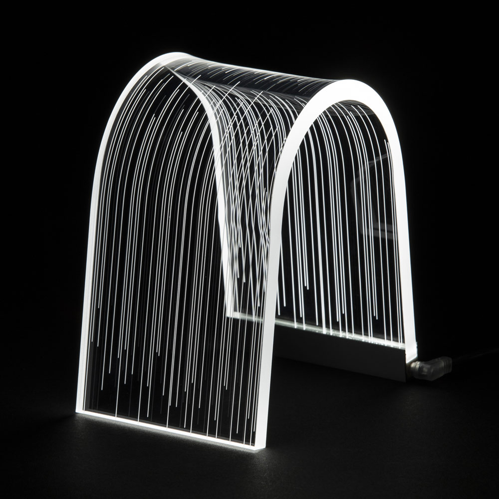 Kjo llambë tavoline është tërësisht e punuar nga kristali akrilik i pastër me dekorim të gdhendur me lazer të motiveve të ndryshme. Karakterizohet nga forma e saj e harkut bashkëkohor dhe moderne. Shiriti led në bazë ndriçon të gjithë trupin e llambës dhe gdhendjet e tij që ndriçojnë mjedisin duke krijuar një atmosferë skenografike dhe efektive. Kristali akrilik është polimeri metakrilat që karakterizohet nga pastërtia e transparencës së tij që tejkalon kristalin natyror.