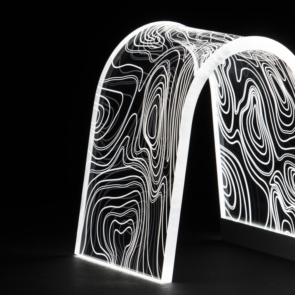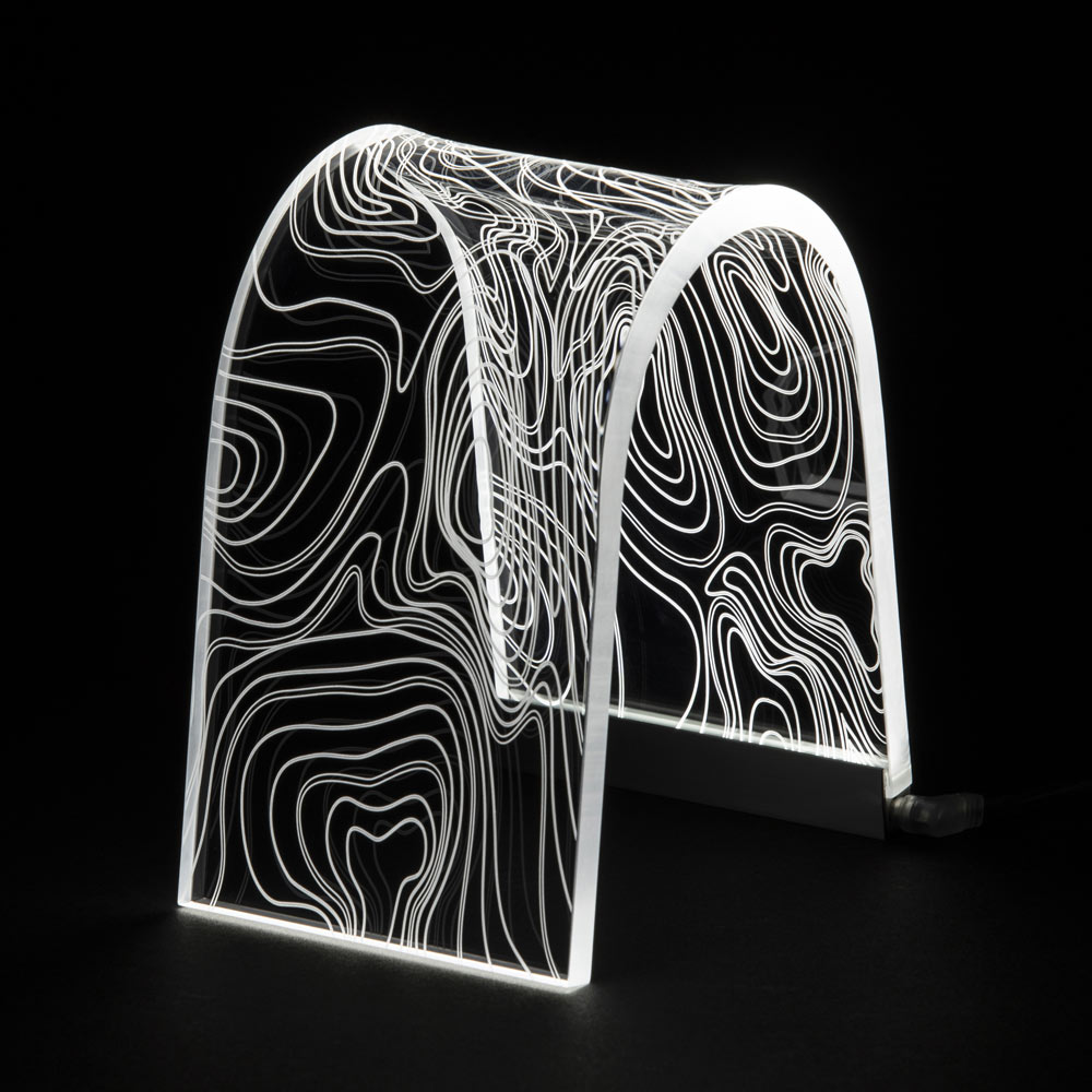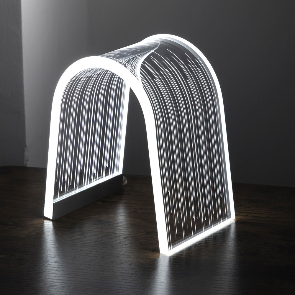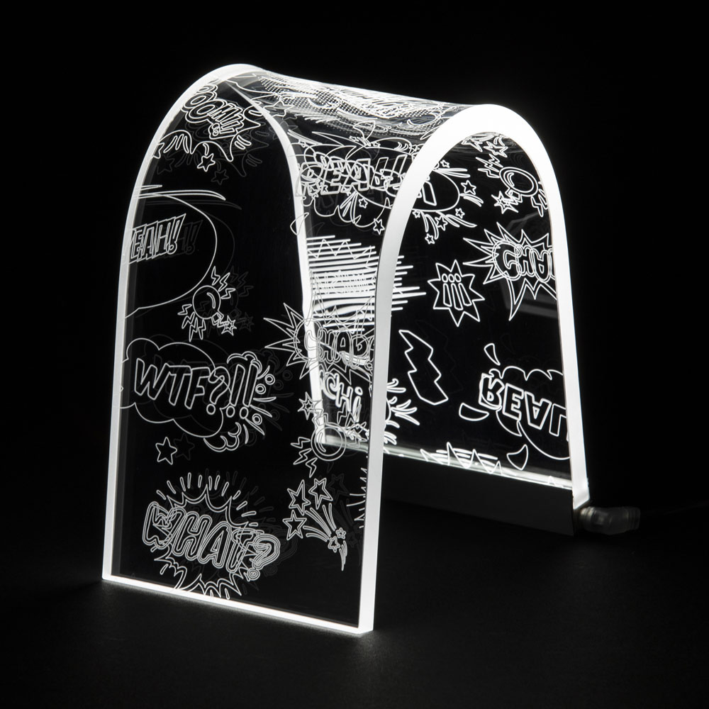 Kjo llambë tavoline është tërësisht e punuar nga kristali akrilik i pastër me dekorim të gdhendur me lazer të motiveve të ndryshme. Karakterizohet nga forma e saj e harkut bashkëkohor dhe moderne. Shiriti led në bazë ndriçon të gjithë trupin e llambës dhe gdhendjet e tij që ndriçojnë mjedisin duke krijuar një atmosferë skenografike dhe efektive. Kristali akrilik është polimeri metakrilat që karakterizohet nga pastërtia e transparencës së tij që tejkalon kristalin natyror.