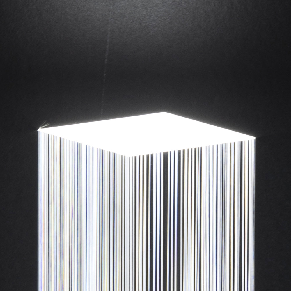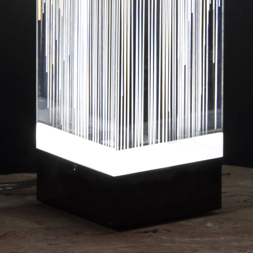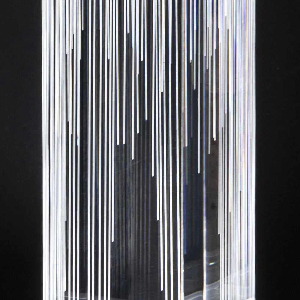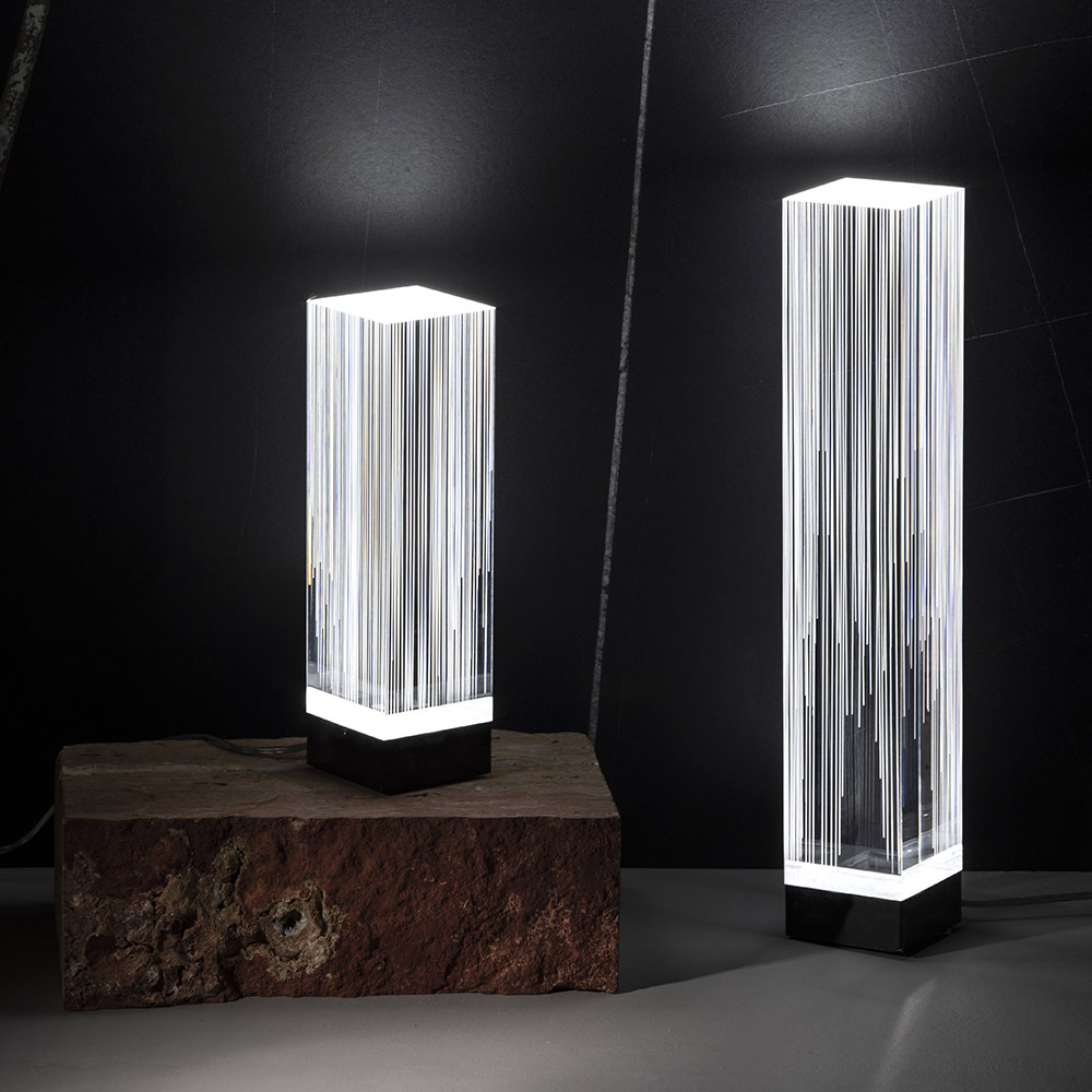 Kjo llambë tavoline përbëhet nga një bllok i vetëm kristal akrilik i prerë dhe i gdhendur me teknologji lazer dhe një bazë me trupin e ndriçimit LED. Sipërfaqja saten e krijuar në këtë mënyrë i jep llambës një efekt skenografik të jashtëzakonshëm që shtrihet në të gjithë lartësinë. Kristali akrilik është polimeri metakrilat që karakterizohet nga pastërtia e transparencës së tij që tejkalon kristalin natyror.