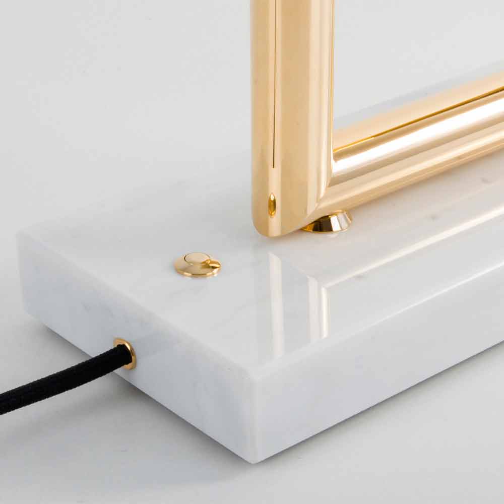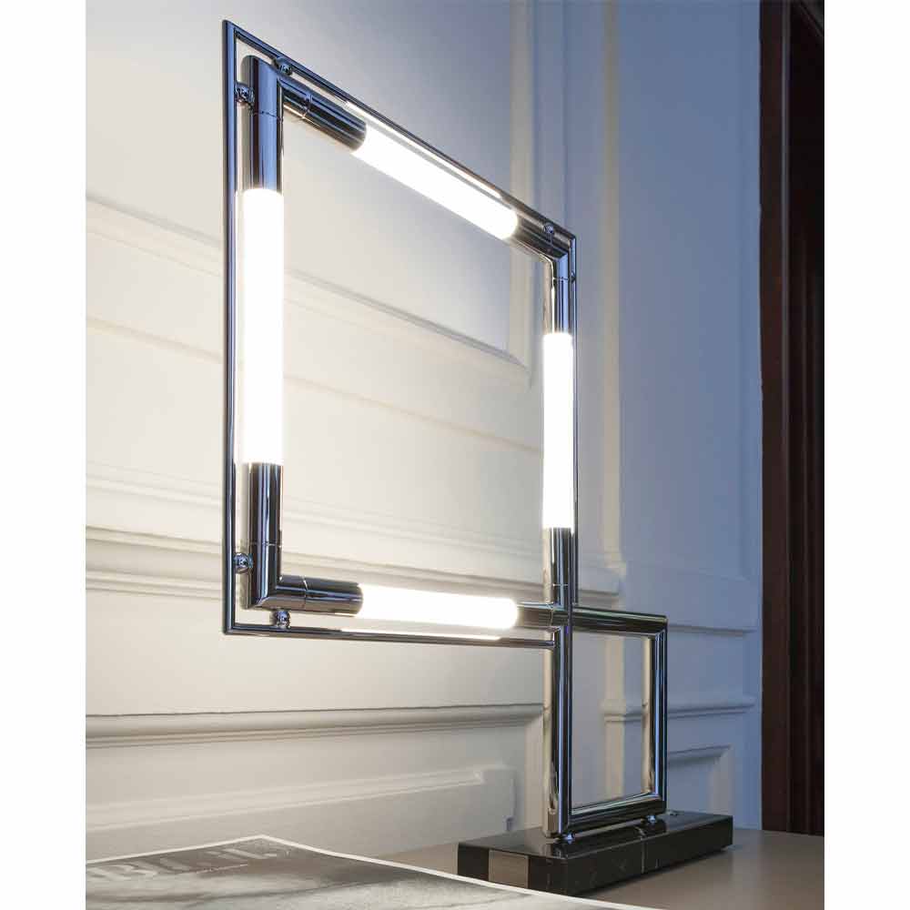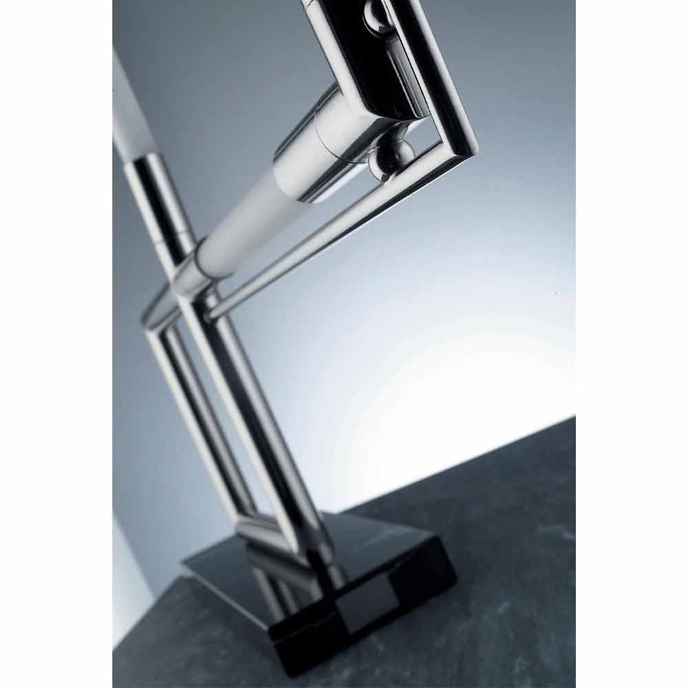 Llambë tavoline e prodhuar në Itali me strukturë bronzi të lëmuar , shpërndarës rrëshire akrilike dhe bazë mermeri të plotë me kabllo elektrike prej pëlhure të zezë, buton të energjisë me rregullator të intensitetit të dritës dhe burime të integruara LED.