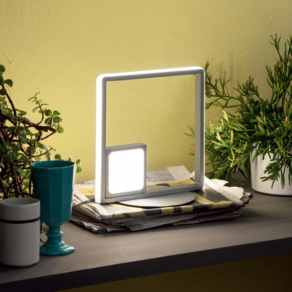 Llambë tavolineprej metali të lyer argjendi ekompletuar me burim LED të integruar me errësim. Një aksesor modern estetika e të cilit karakterizohet nga forma të thjeshta dhe linja origjinale dhe katrore , i konceptuar dhe projektuar për të ndriçuar dhe arreduar hapësirat shtëpiake si dhomat e ndenjes, dhomat e gjumit, zyrat dhe studimet në mënyrë ekskluzive dhe elegante. Finitura e rafinuar nënvizon dizajnin e rafinuar dhe e bën atë një produkt unik të llojit të tij për një rezultat të përshtatshëm për ata që kërkojnë një përsosmëri estetike të formave gjeometrike edhe në arredimin e shtëpisë së tyre.