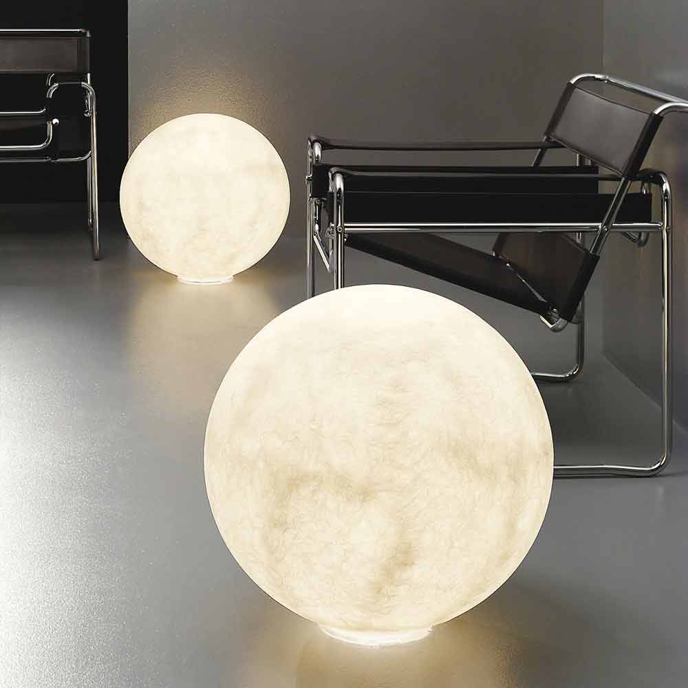 Llambë tavoline moderne sferike In-es.artdesign Nebulite Floor Moon Llamba e dyshemesë Floor Moon është një plotësues ndriçues me efekt të shkëlqyeshëm, ideal për të dekoruar me personalitet dhomën e ndenjes, dhomën e gjumit ose dhomën e punës. Prodhuar nga In-es.artdesign për koleksionin Luna, ai riprodhon atmosferën magjike hënore, falë materialit nga i cili përbëhet: Nebulite® , një material i përbërë nga rrëshirë dhe fibra, venat e të cilit i japin llambës këtë efekt të veçantë.