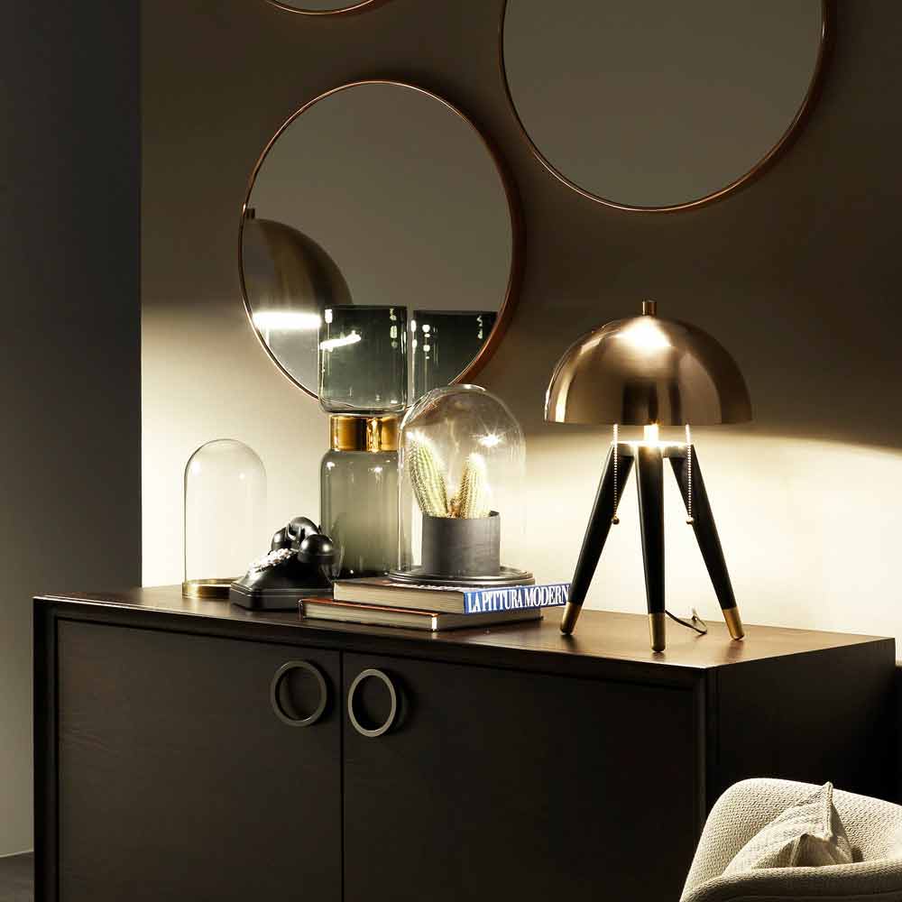 Kjo llambë tryeze është e përbërë nga një strukturë metalike e zezë me një abazhur prej bronzi të krehur me kube që përputhet me detajet në pjesën e poshtme të 3 këmbëve mbështetëse, gjithashtu prej bronzi. Përdorimi i këtyre shijeve të rafinuara përfundon në kombinim me një dizajn të thjeshtë dhe linear i jep jetë një aksesori mobilues me një personalitet të fortë që nuk kalon pa u vënë re. Prodhuar tërësisht në Itali, ky objekt dizajni është në gjendje të transformojë atmosferën e një dhome, duke pasuruar estetikën dhe duke shtuar vlerën, duke krijuar në të njëjtën kohë një atmosferëshumë elegante.