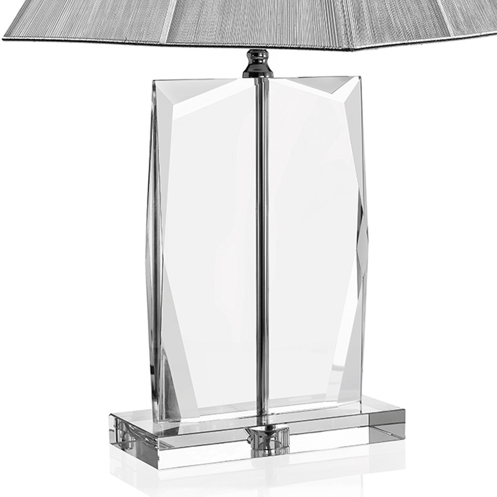 Llamba e tryezës ka një dizajn simpatik dhe me shkëlqim me bazën e bërë nga kristali monumental i çmuar dhe njëabazhur katror me fije argjendi.