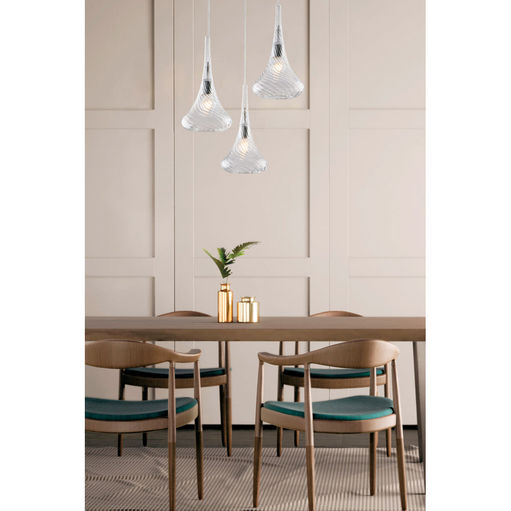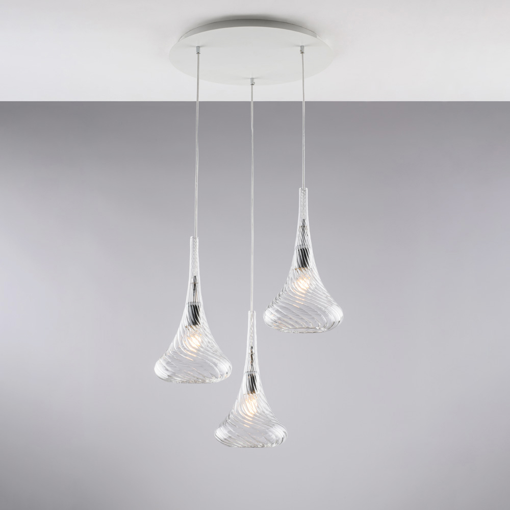 E lehtë dhe elegante, kjo varëse hekuri e punuar me dorë me xham Pyrex është një zgjidhje ndriçimi me një dizajn të rafinuar dhe bashkëkohor. Tre difuzorët prej qelqi Pyrex , me format e tyre të buta dhe sinuoze, janë të varur individualisht, duke krijuar një efekt dinamik të këndshëm dhe një shpërndarje drite harmonike dhe mbështjellëse.