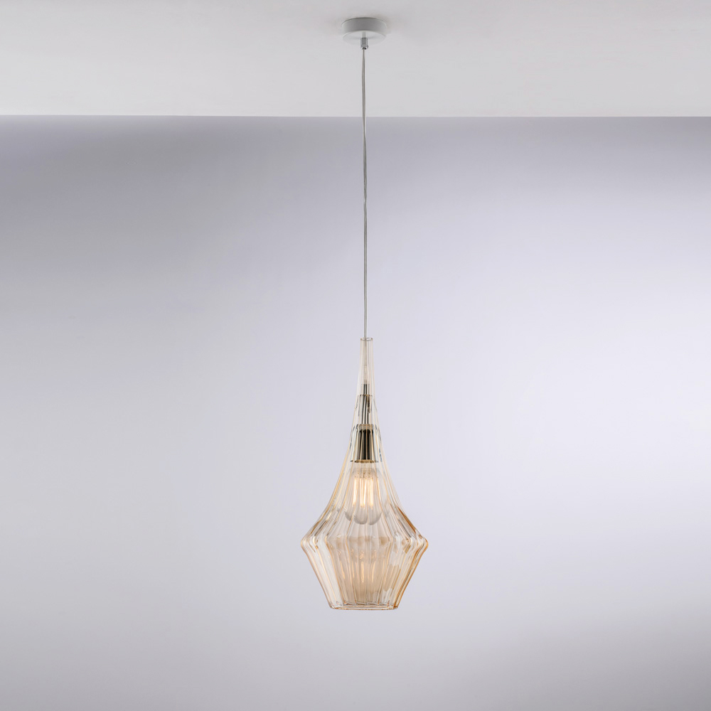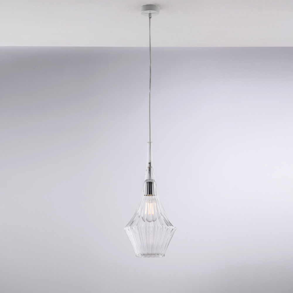 E thjeshtë dhe e rafinuar, kjo varëse hekuri e punuar me dorë me xham Pyrex është një zgjidhje bashkëkohore ndriçimi, ideale për të shtuar elegancë dhe lehtësi në hapësira. Difuzori i vetëm prej qelqi Pyrex , me formën e tij gjeometrike dhe të fasetuar, shpërndan dritën në mënyrë të barabartë, duke krijuar një atmosferë mikpritëse dhe të sofistikuar.