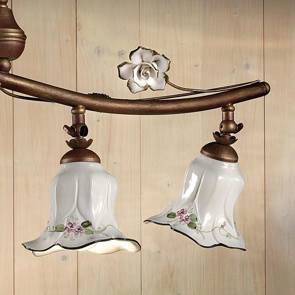 Llambë tavani lineare 4 drita në metal dhe qeramikë me trëndafila të lyer me dorë të prodhuara në Itali nga Ferroluce.