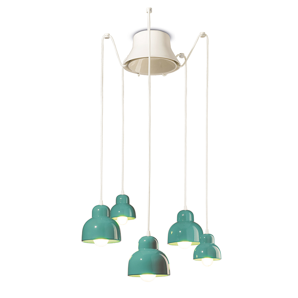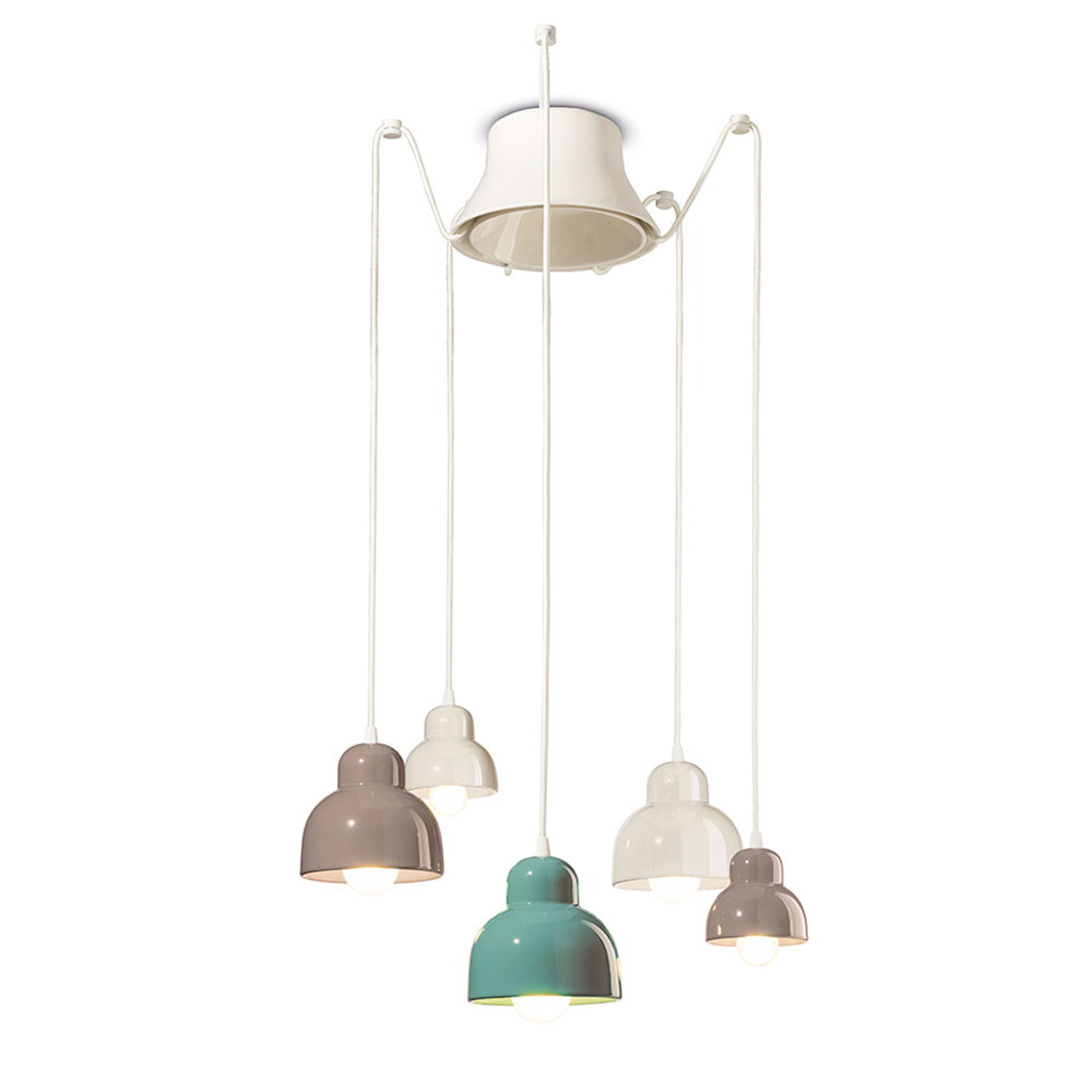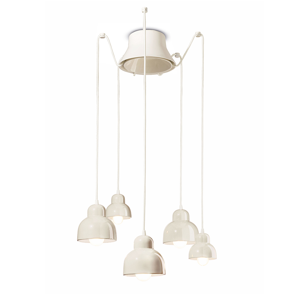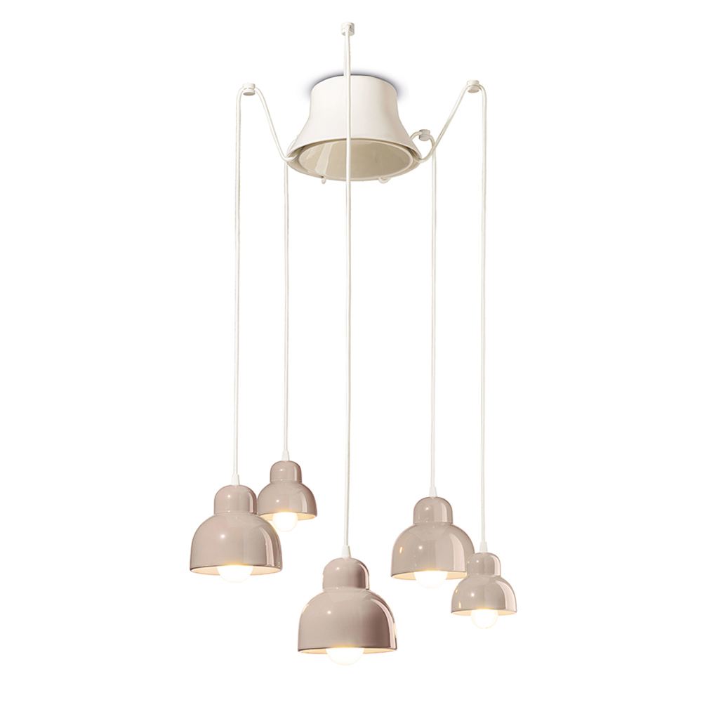 Kjo llambë varëse qeramike është një shembull simpatik i dizajnit bashkëkohor të frymëzuar nga tradita . Pesë dritat e saj varëse rrezatojnë në lartësi të ndryshme, si një vallëzim vizual i formave dhe dritave në hapësirë.